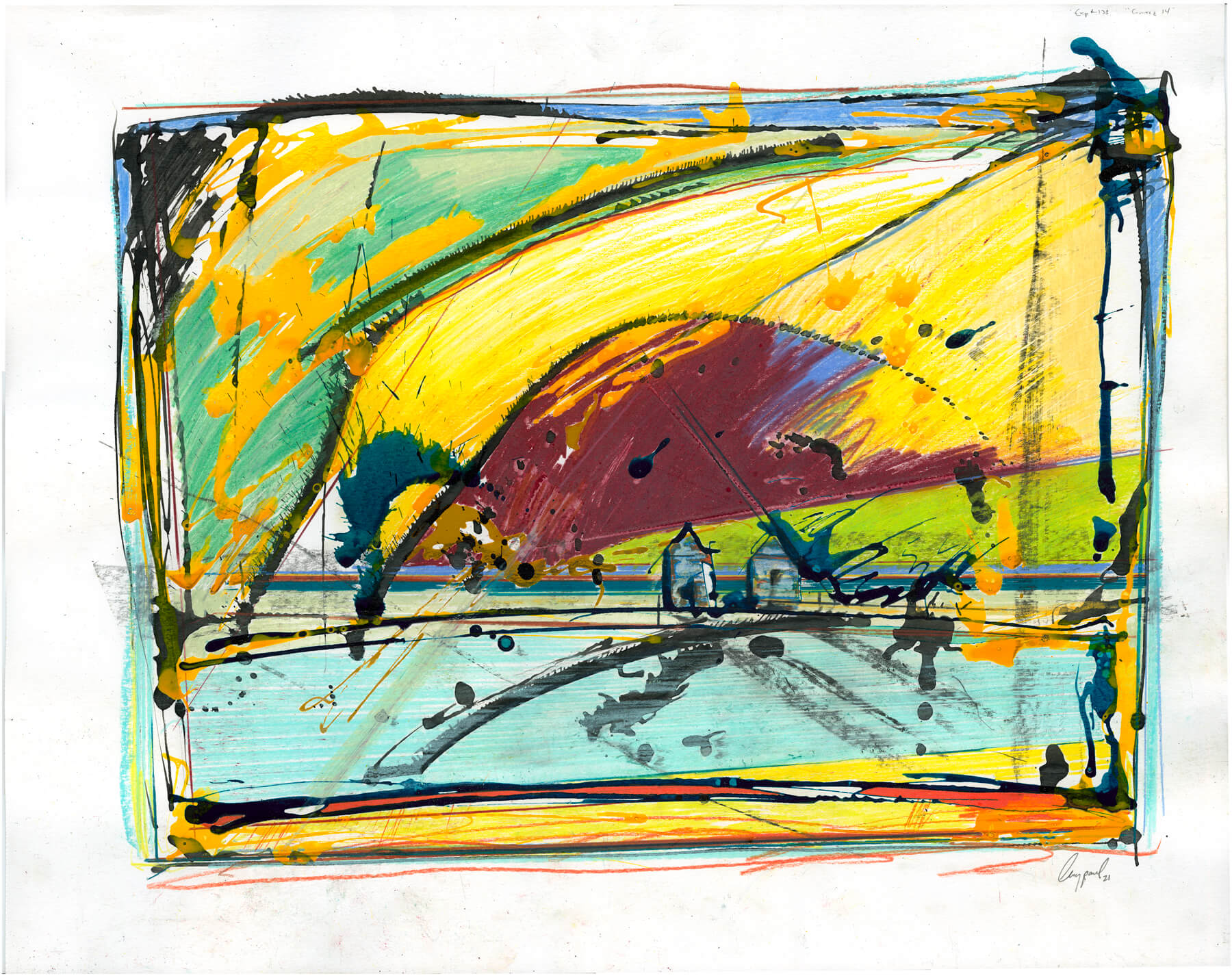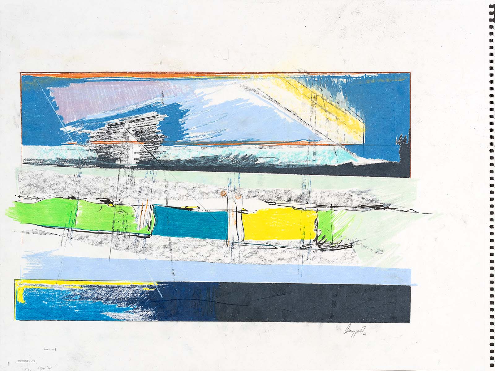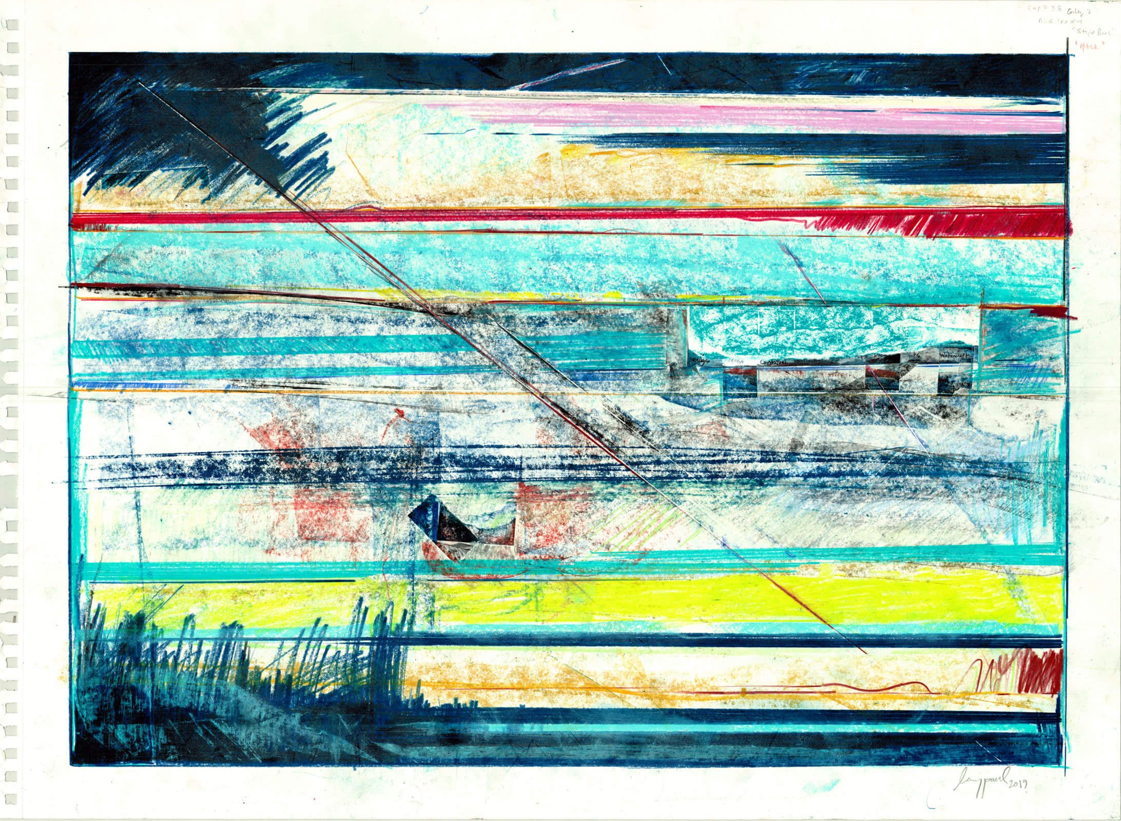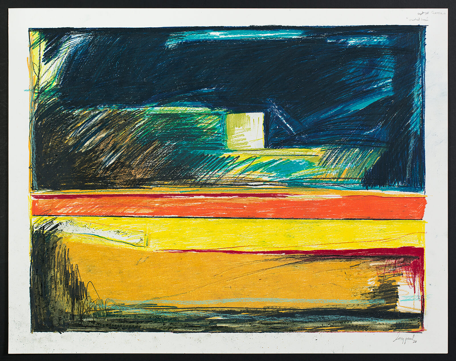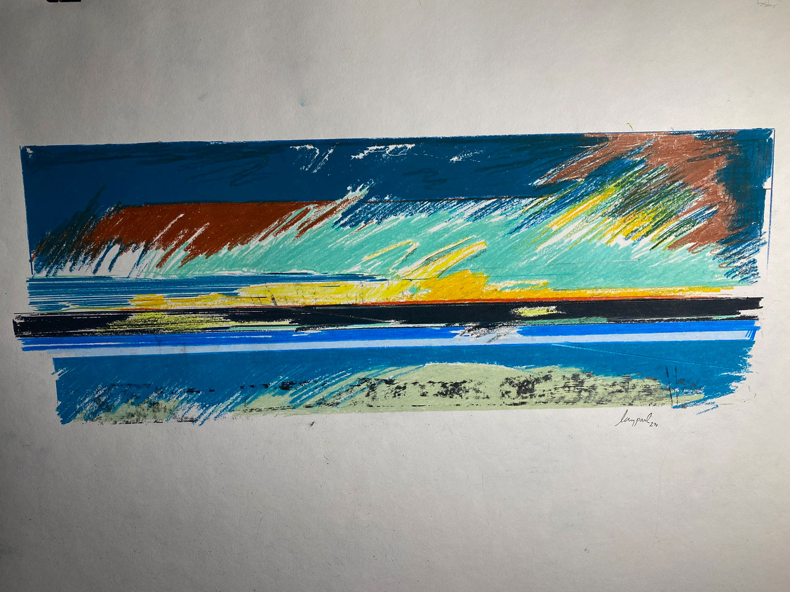 Personal, yet open and outwardly expressive, the Sunsets series presents an abstract expressionistic quality with an overlapping and abutting color technique that contrasts and brings the movements together at the same time. The typical colors are easily inspired by a wild brilliance offered by the mix of sunsets, storms, and open blue and green water. There is a rather “angry” application method in creating these artworks as noted in some frenzy of the pencil strokes, yet anger and calm can be appreciated together. The beauty of a fishing village often combines its aged infrastructure with the beauty and color of sunsets and the water vessels that are found within them in what becomes a creatively expressed scene or seascape.