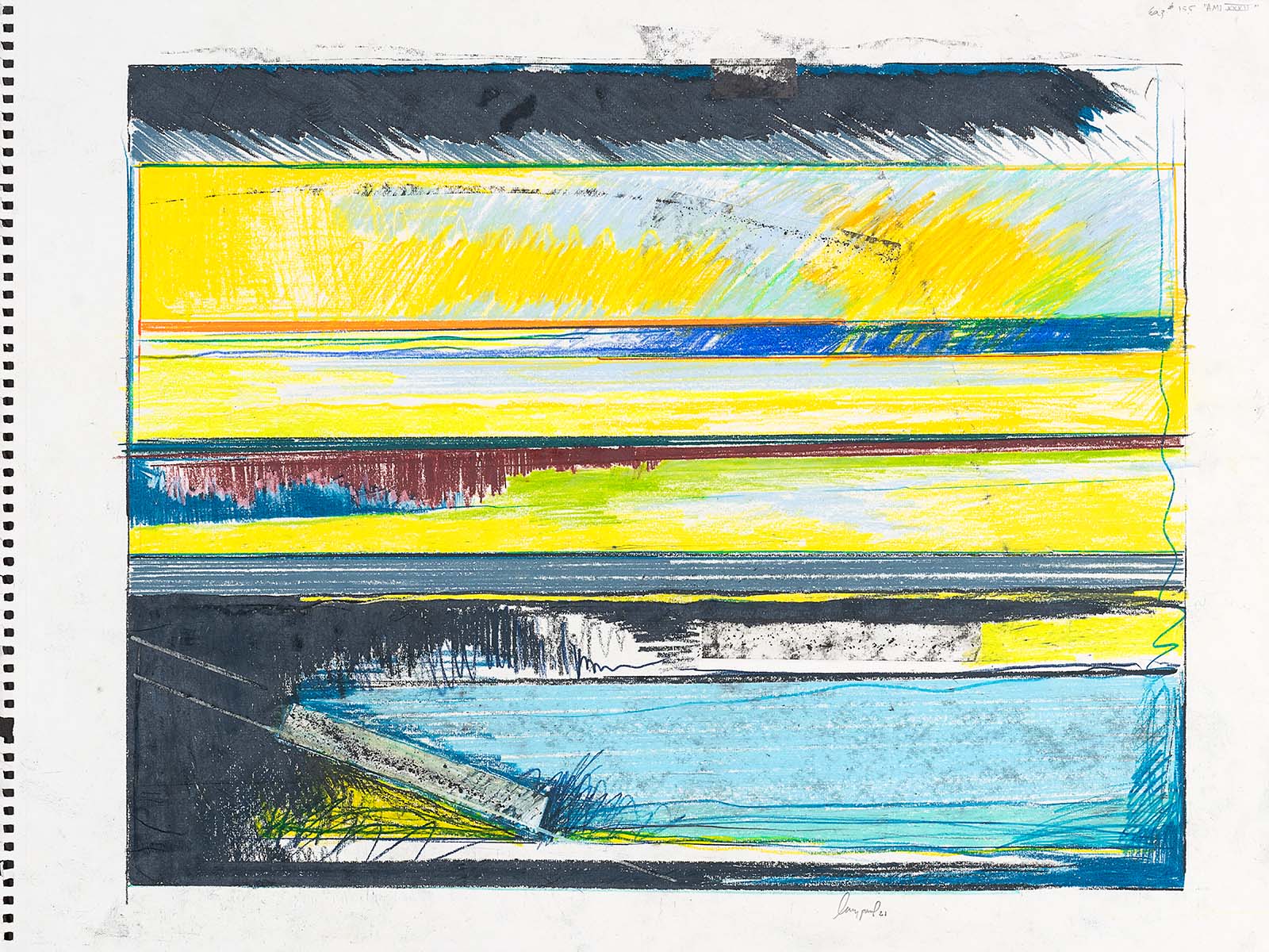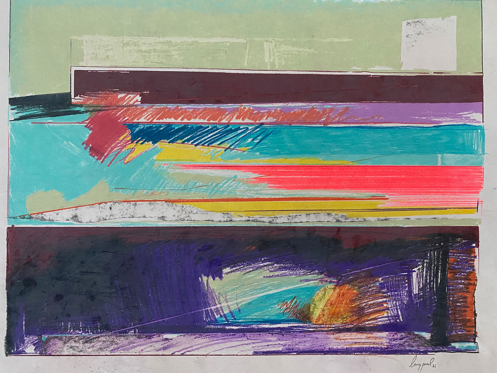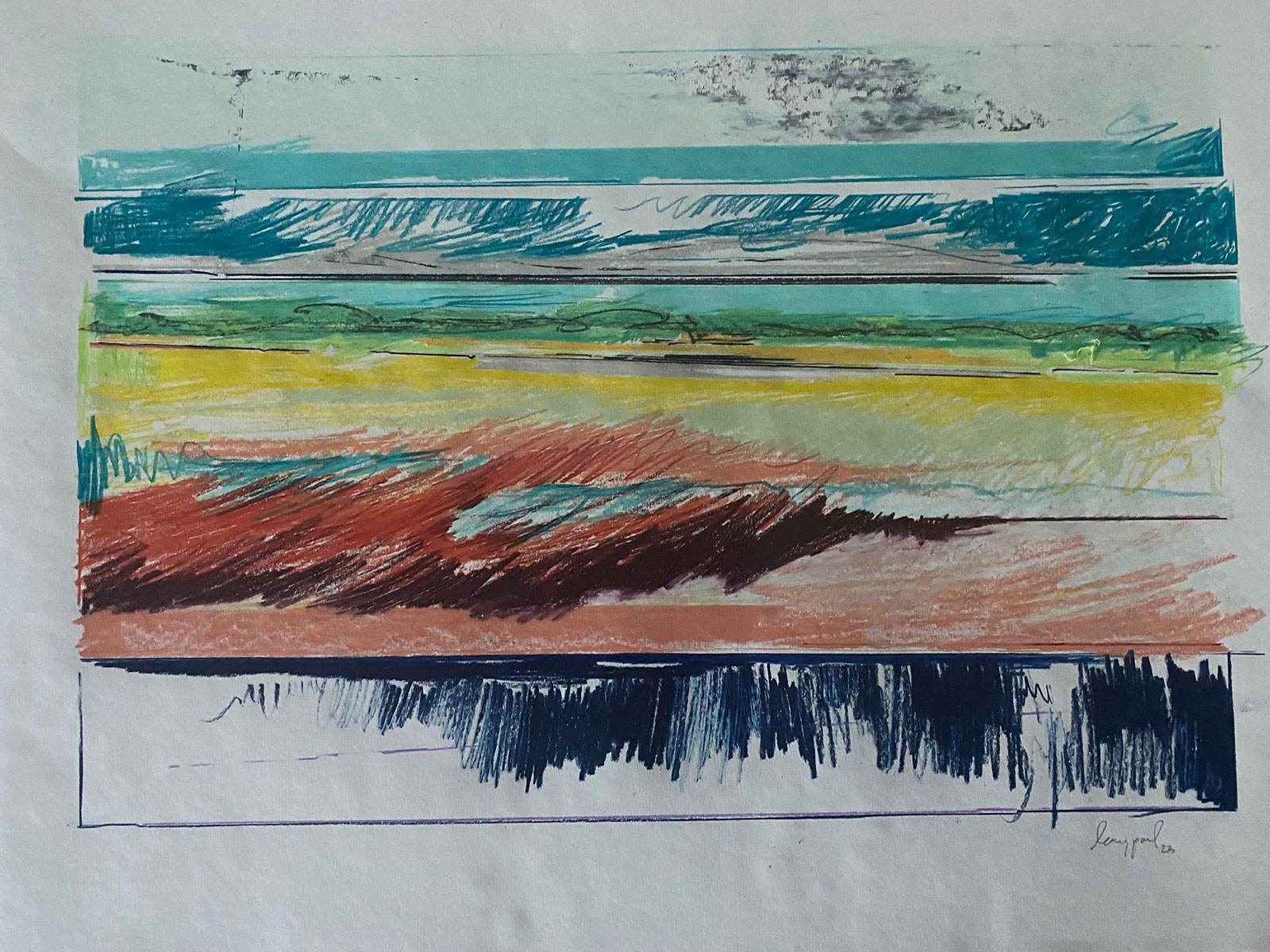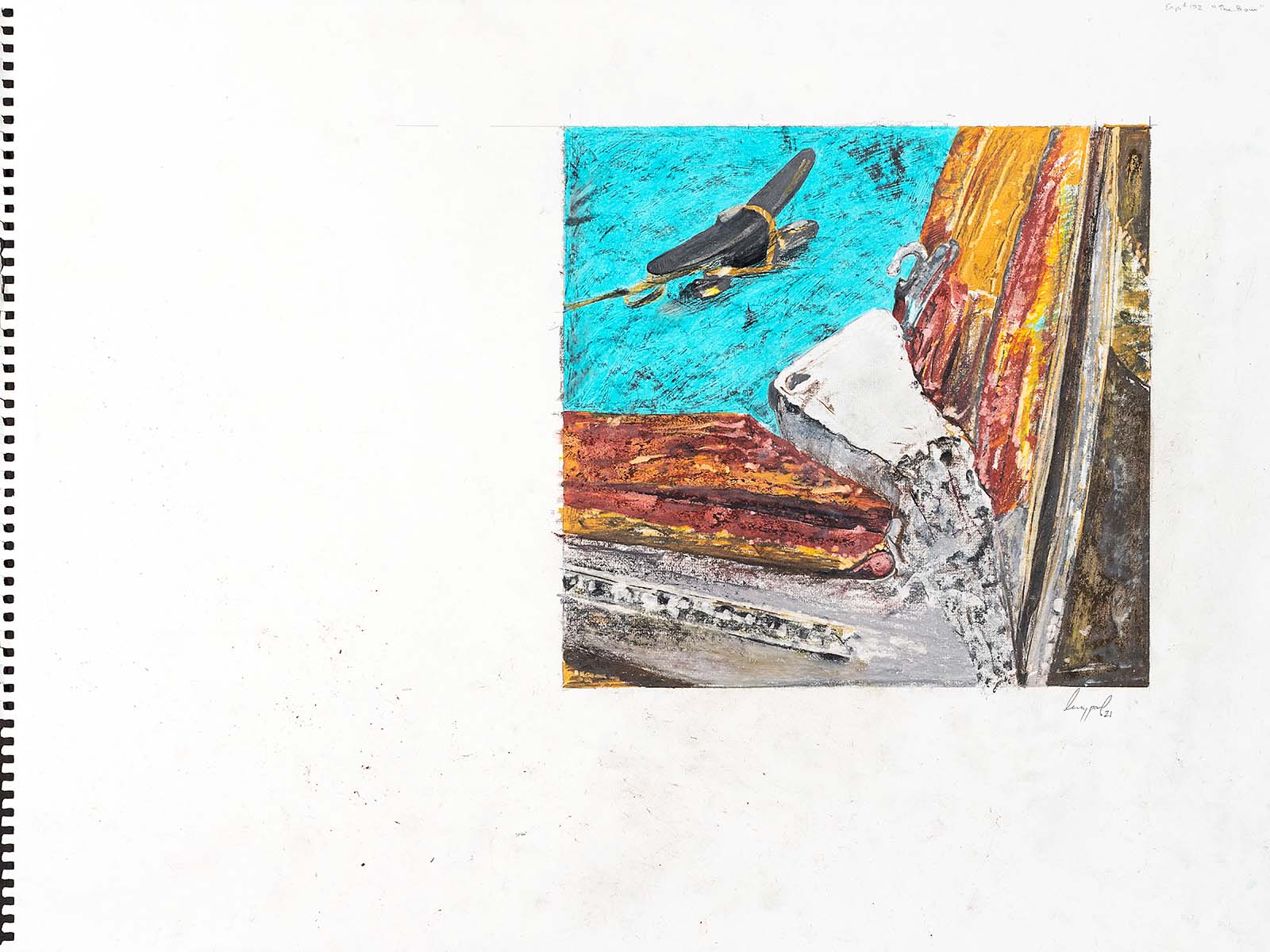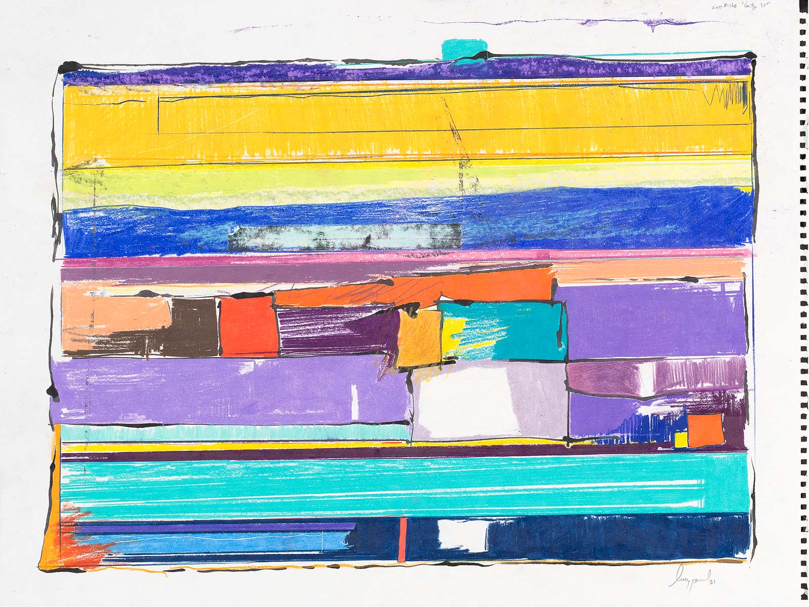 Personal, yet open and outwardly expressive, the Sunsets series presents an abstract expressionistic quality with an overlapping and abutting color technique that contrasts and brings the movements together at the same time. The typical colors are easily inspired by a wild brilliance offered by the mix of sunsets, storms, and open blue and green water. There is a rather “angry” application method in creating these artworks as noted in some frenzy of the pencil strokes, yet anger and calm can be appreciated together. The beauty of a fishing village often combines its aged infrastructure with the beauty and color of sunsets and the water vessels that are found within them in what becomes a creatively expressed scene or seascape.