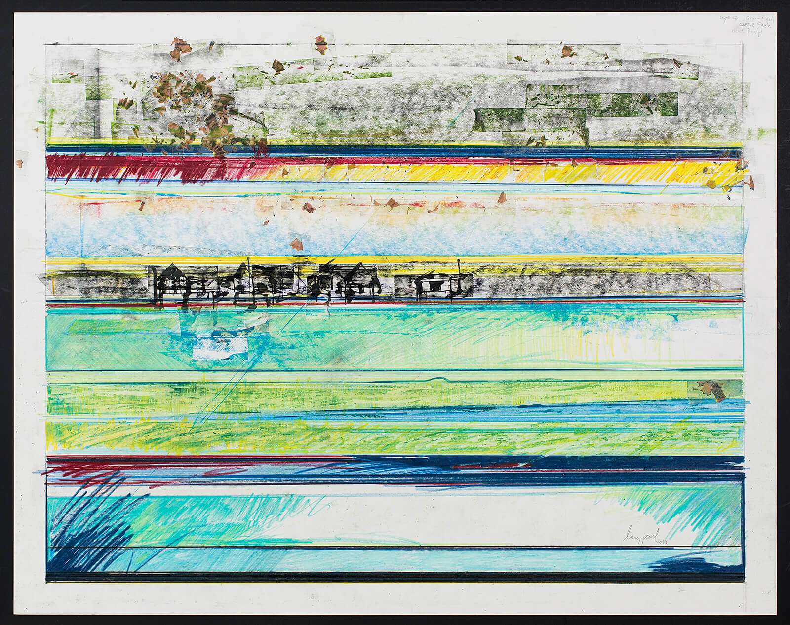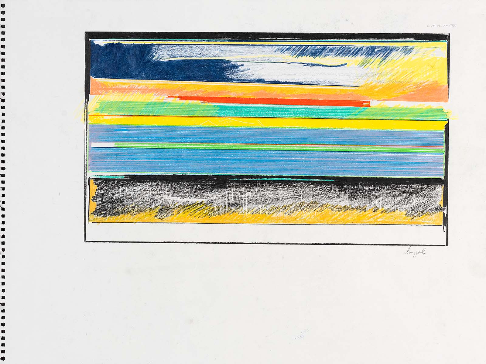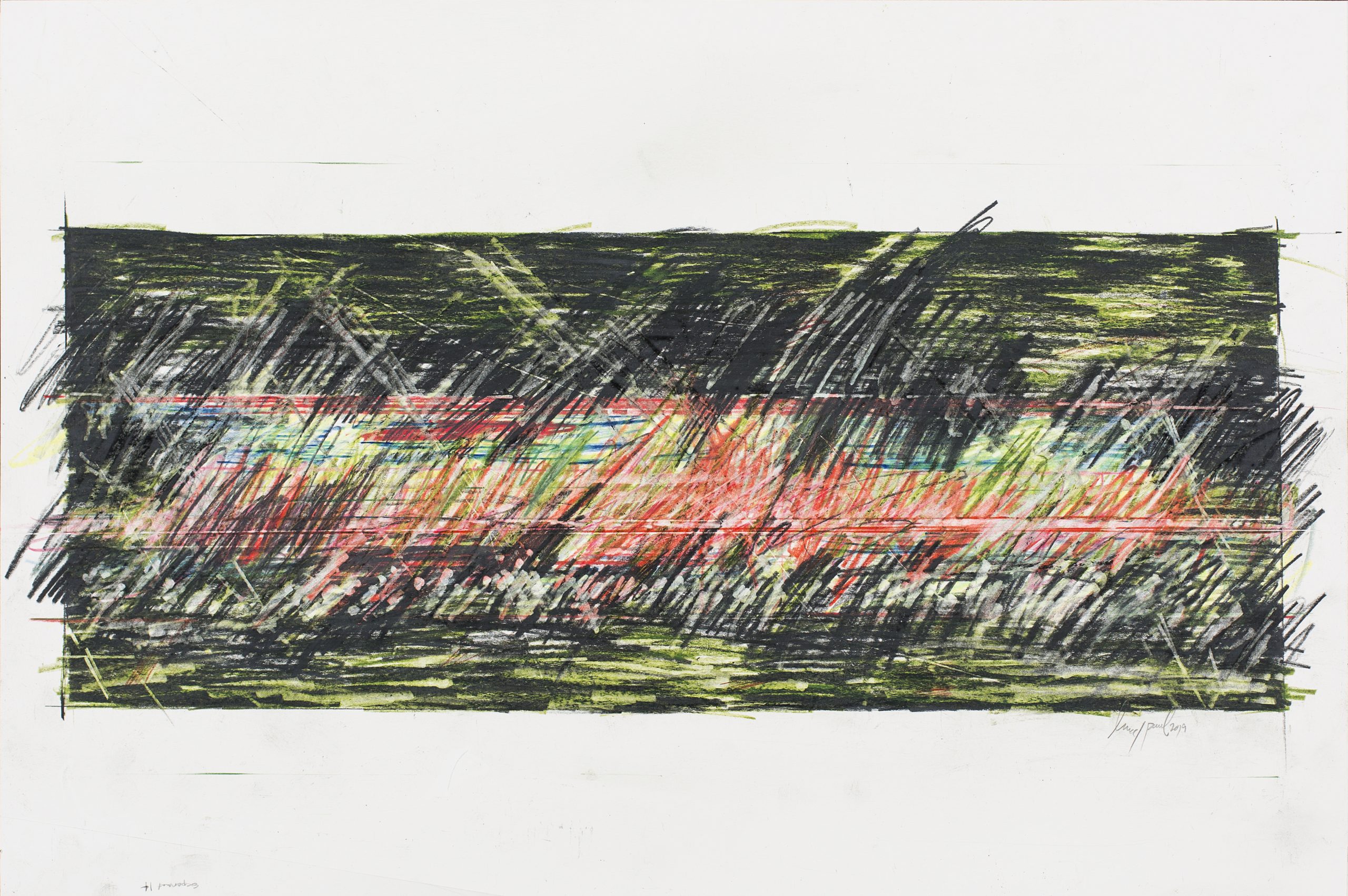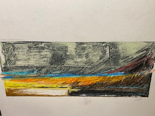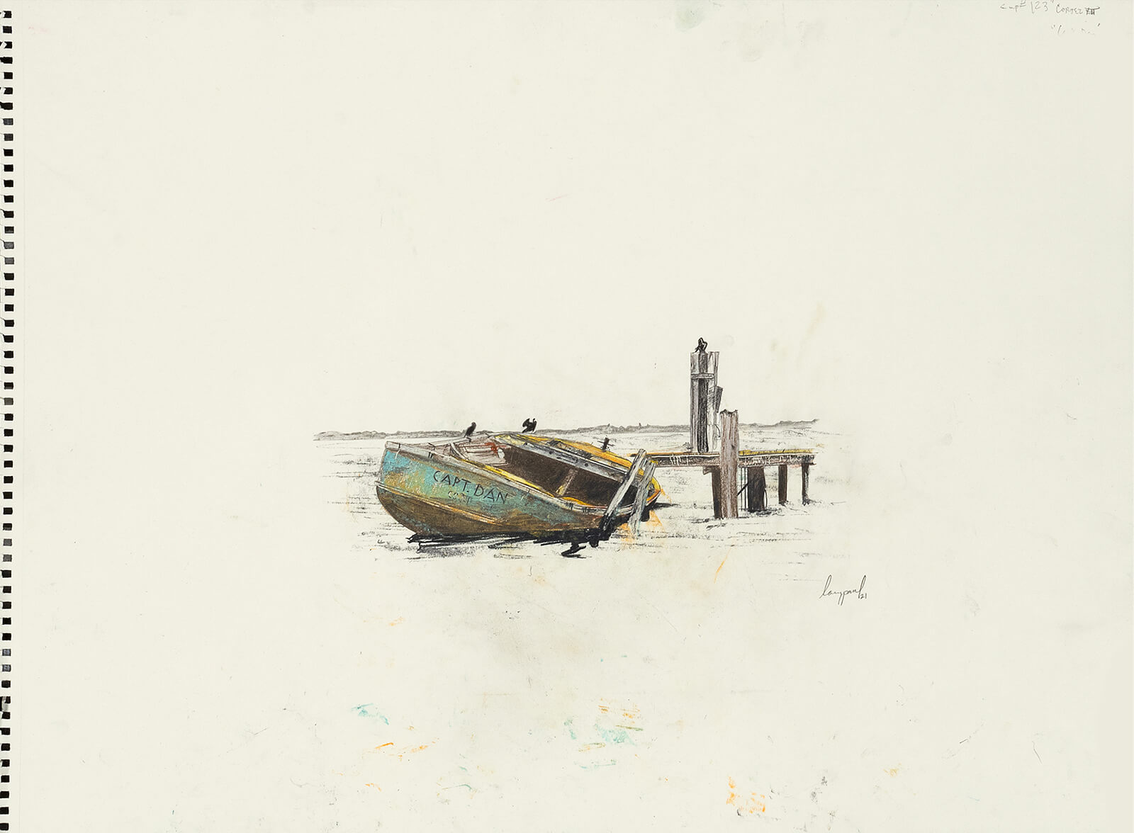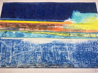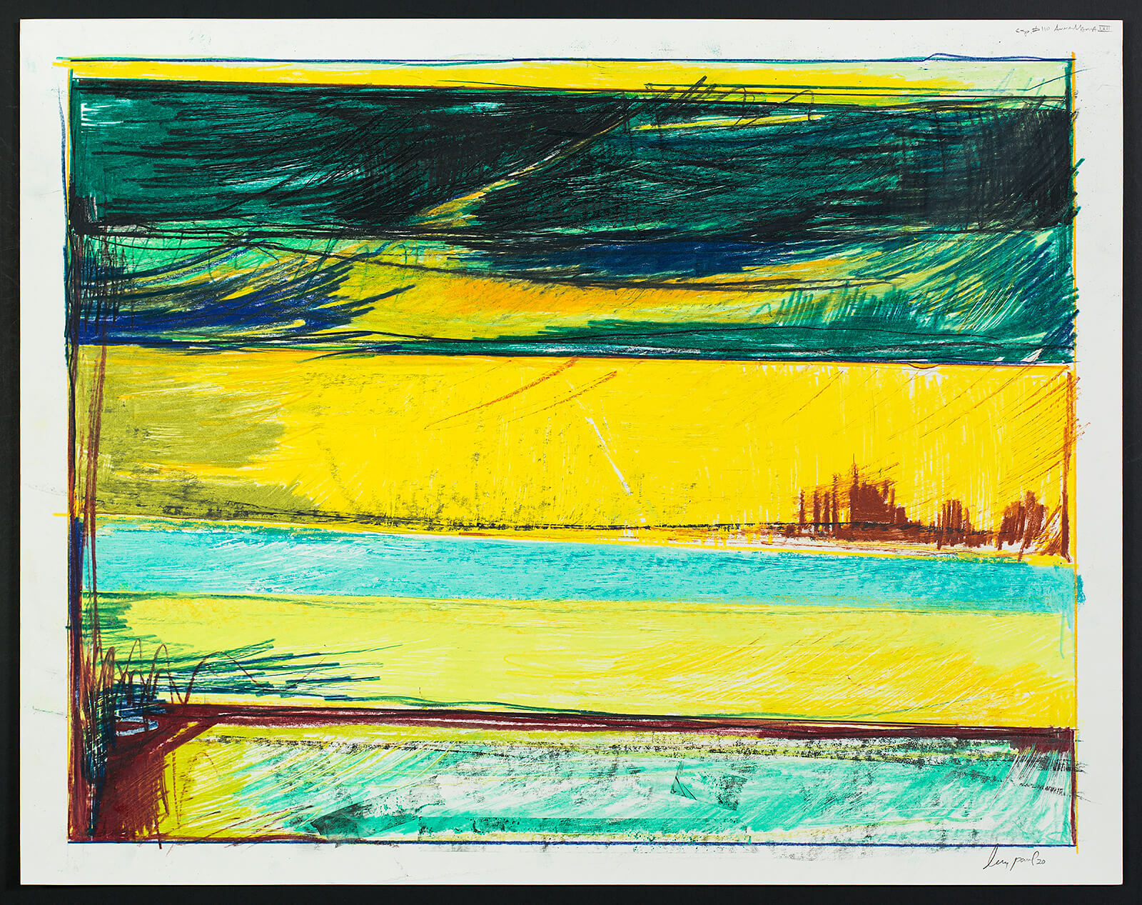 Personal, yet open and outwardly expressive, the Sunsets series presents an abstract expressionistic quality with an overlapping and abutting color technique that contrasts and brings the movements together at the same time. The typical colors are easily inspired by a wild brilliance offered by the mix of sunsets, storms, and open blue and green water. There is a rather “angry” application method in creating these artworks as noted in some frenzy of the pencil strokes, yet anger and calm can be appreciated together. The beauty of a fishing village often combines its aged infrastructure with the beauty and color of sunsets and the water vessels that are found within them in what becomes a creatively expressed scene or seascape.