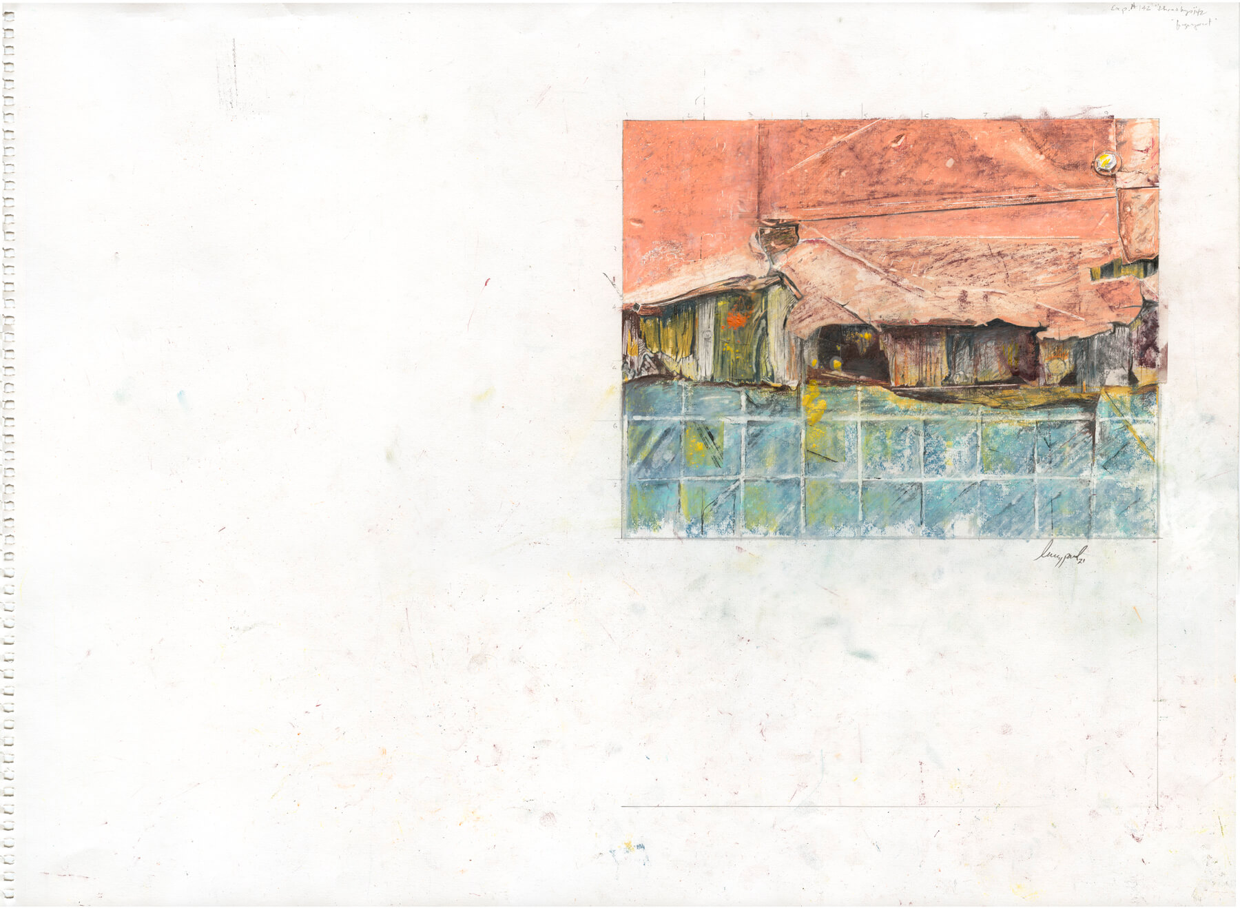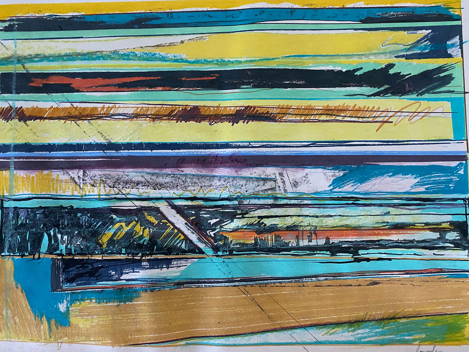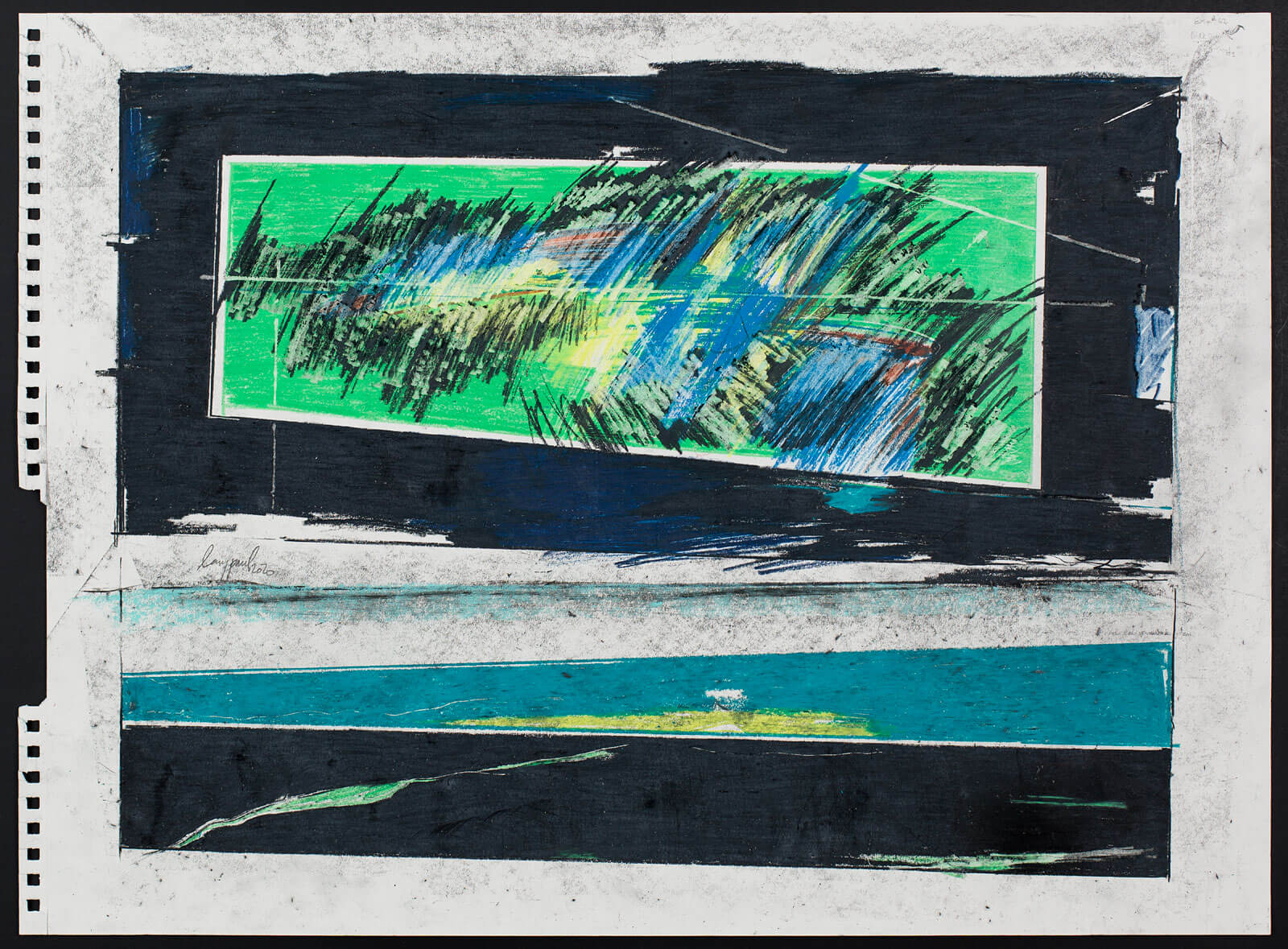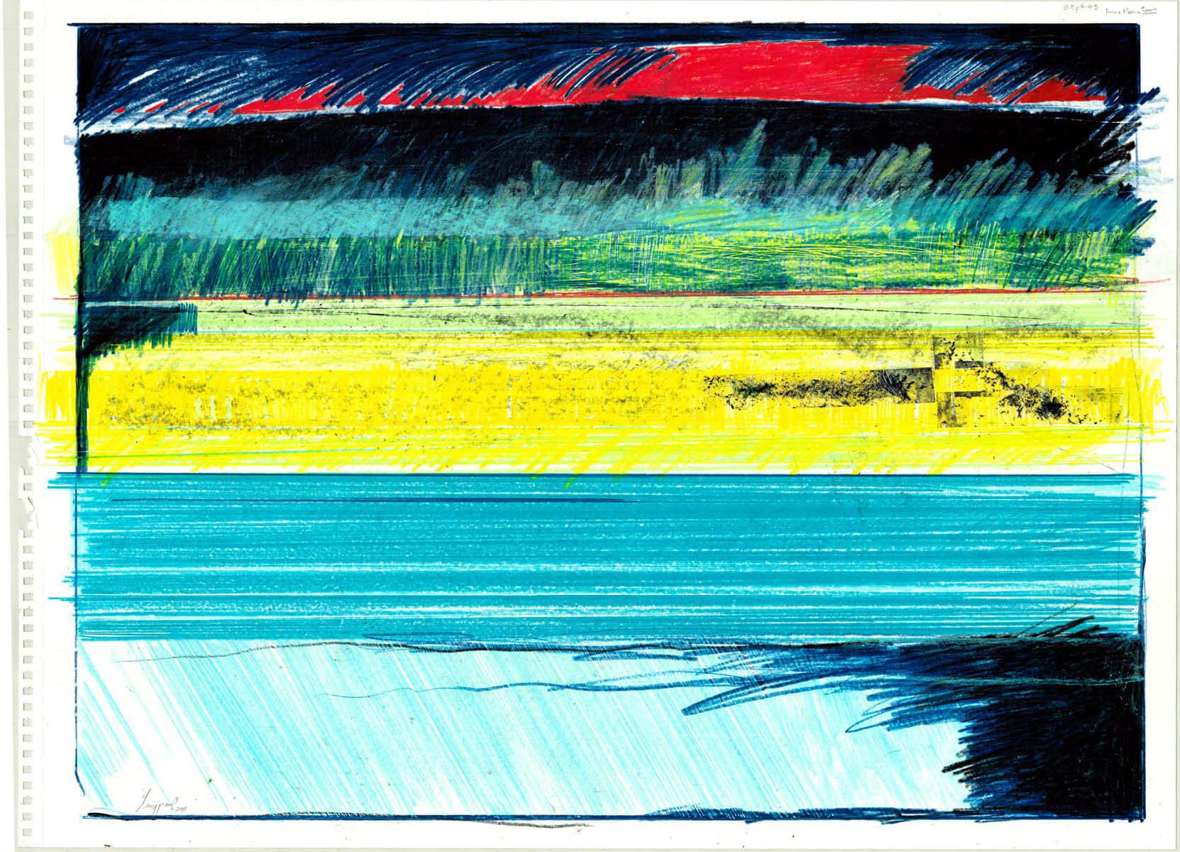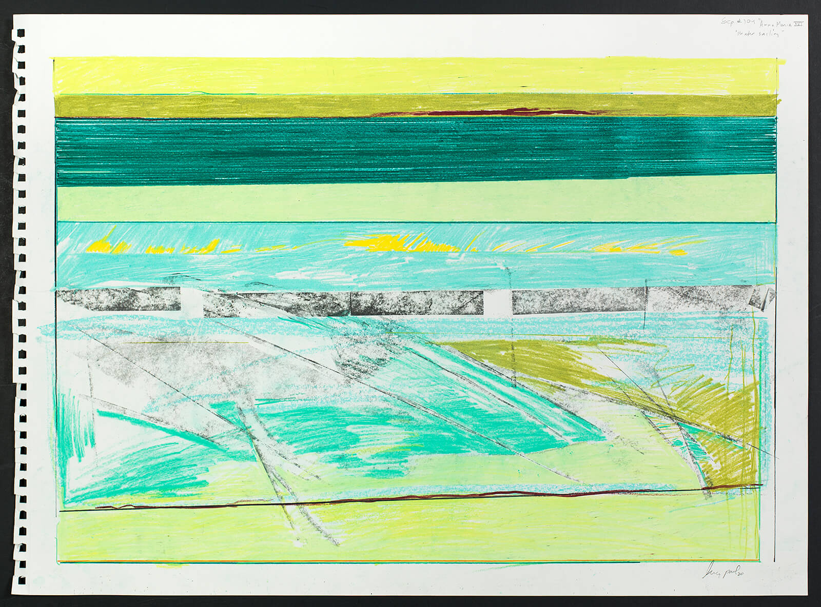 Personal, yet open and outwardly expressive, the Sunsets series presents an abstract expressionistic quality with an overlapping and abutting color technique that contrasts and brings the movements together at the same time. The typical colors are easily inspired by a wild brilliance offered by the mix of sunsets, storms, and open blue and green water. There is a rather “angry” application method in creating these artworks as noted in some frenzy of the pencil strokes, yet anger and calm can be appreciated together. The beauty of a fishing village often combines its aged infrastructure with the beauty and color of sunsets and the water vessels that are found within them in what becomes a creatively expressed scene or seascape.