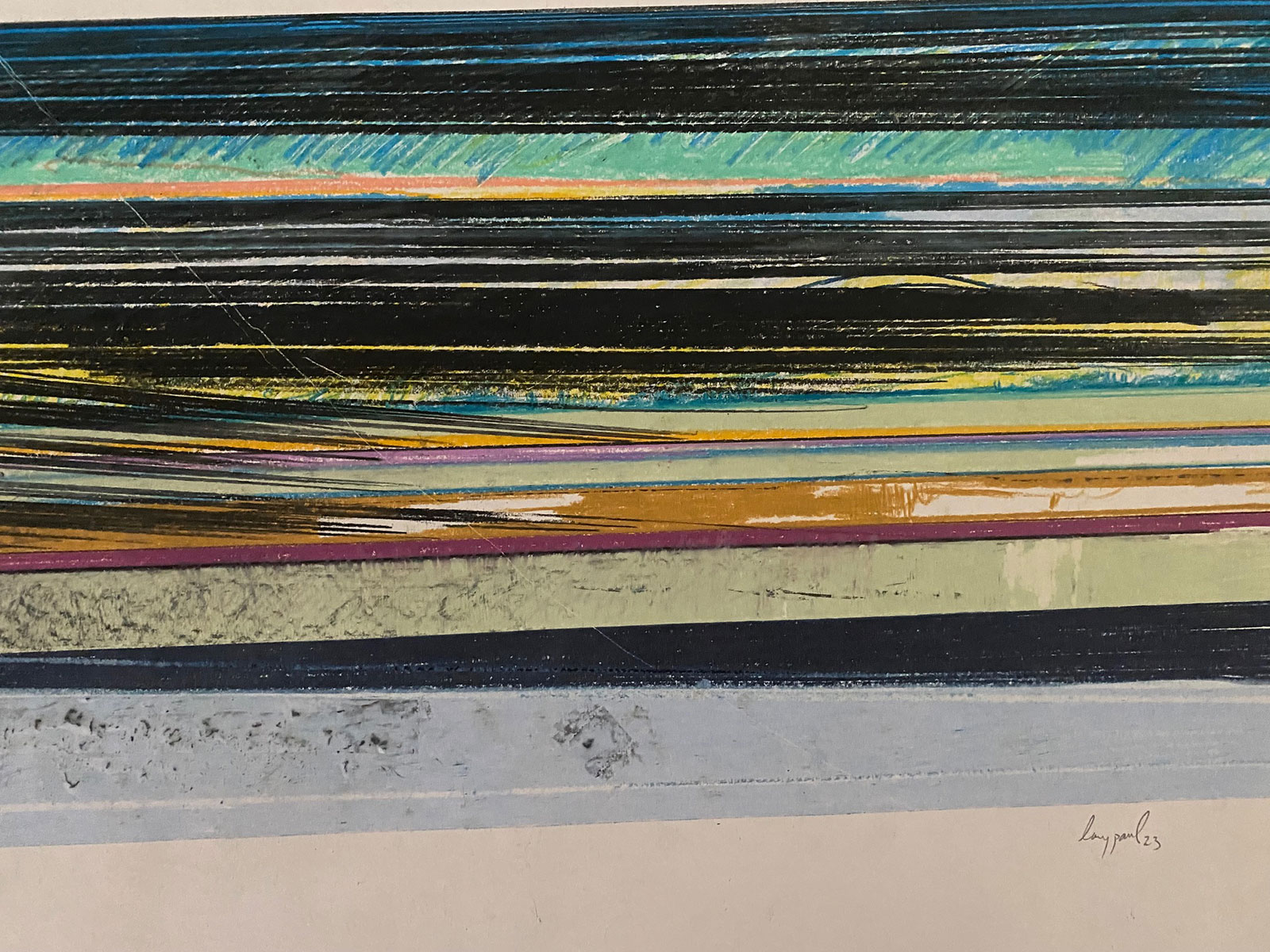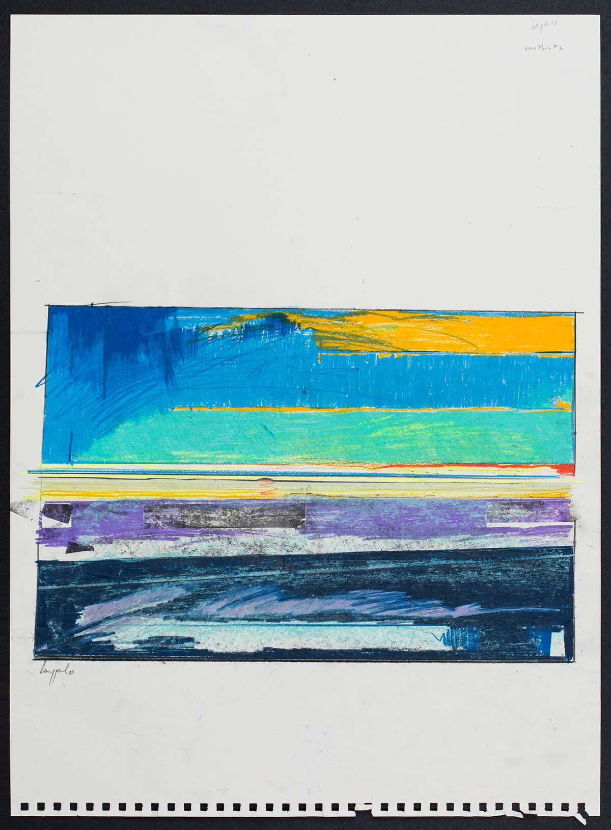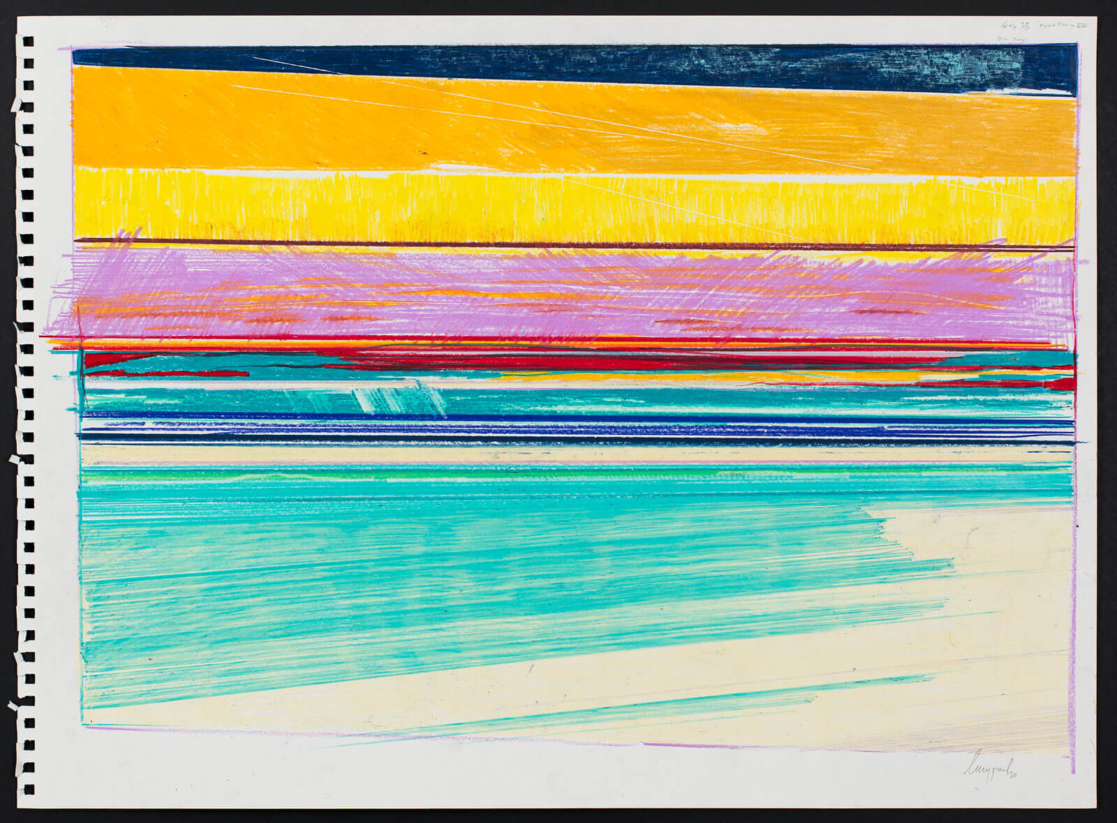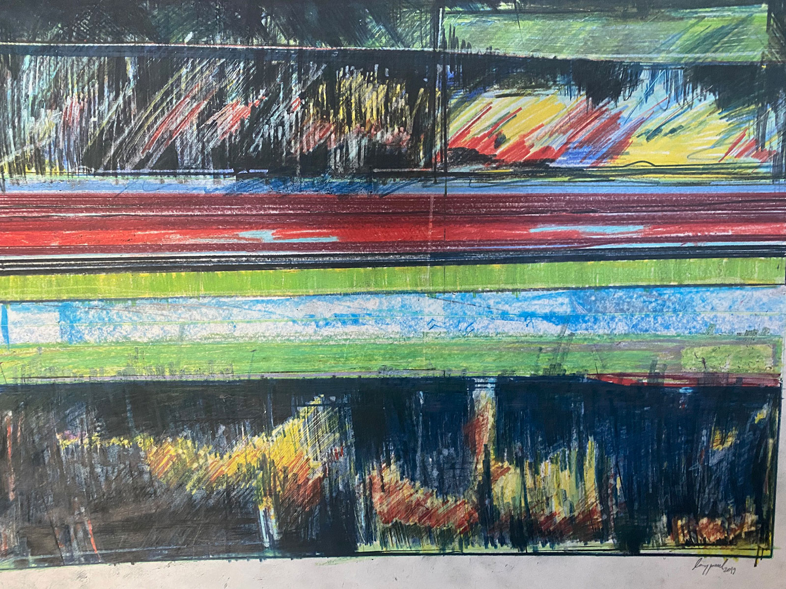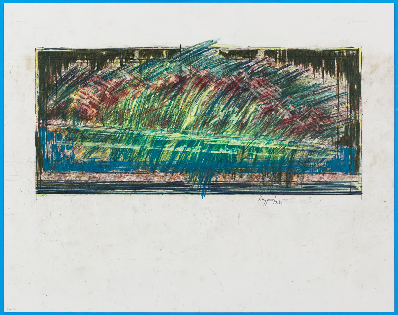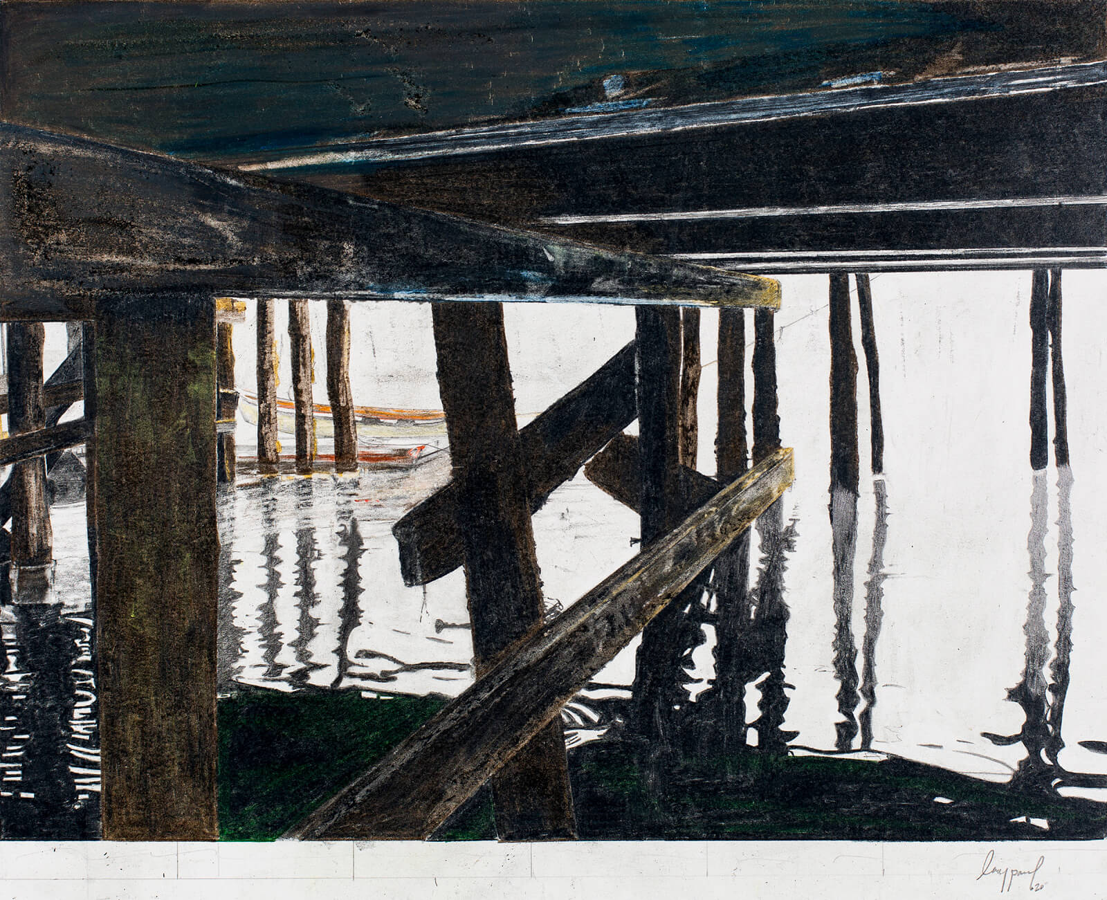 Personal, yet open and outwardly expressive, the Sunsets series presents an abstract expressionistic quality with an overlapping and abutting color technique that contrasts and brings the movements together at the same time. The typical colors are easily inspired by a wild brilliance offered by the mix of sunsets, storms, and open blue and green water. There is a rather “angry” application method in creating these artworks as noted in some frenzy of the pencil strokes, yet anger and calm can be appreciated together. The beauty of a fishing village often combines its aged infrastructure with the beauty and color of sunsets and the water vessels that are found within them in what becomes a creatively expressed scene or seascape.