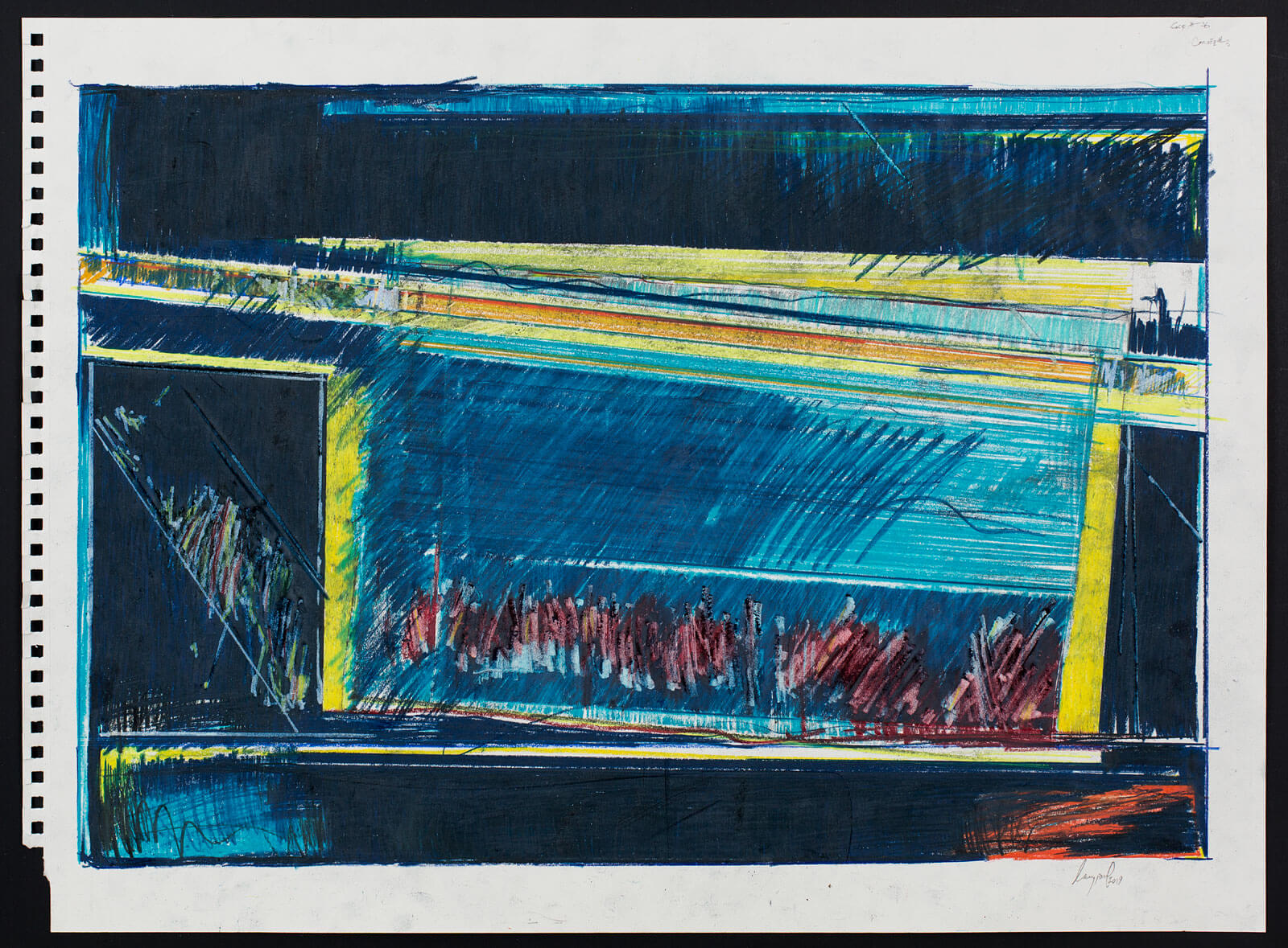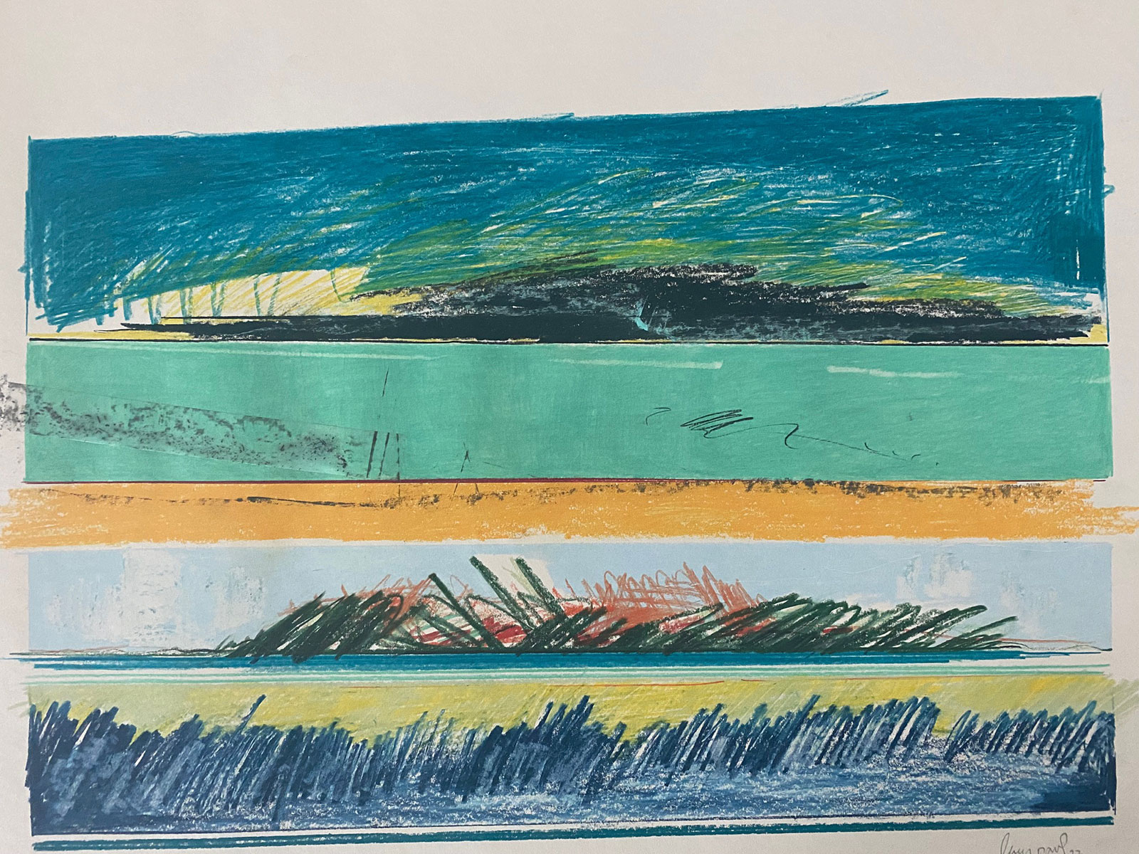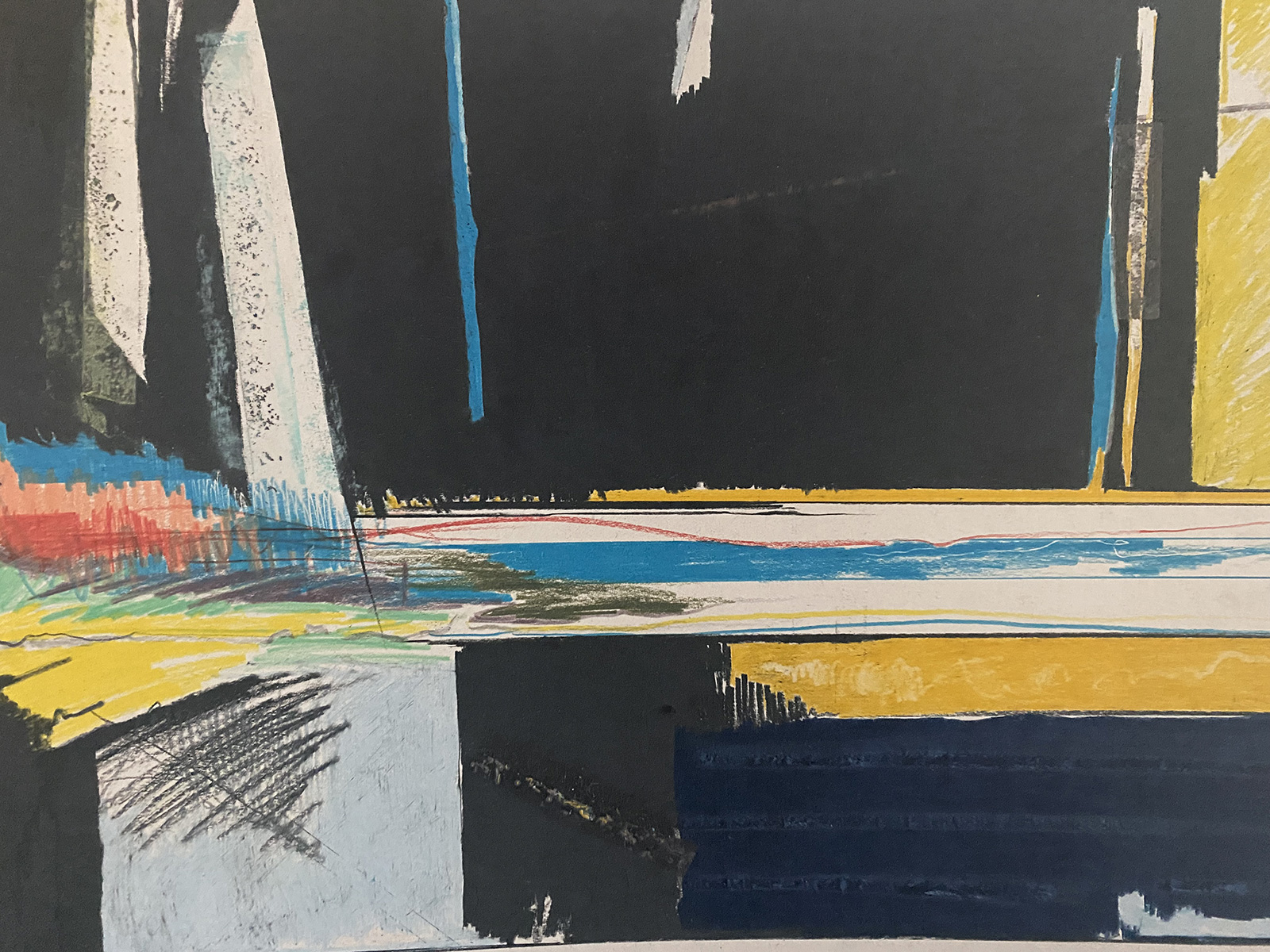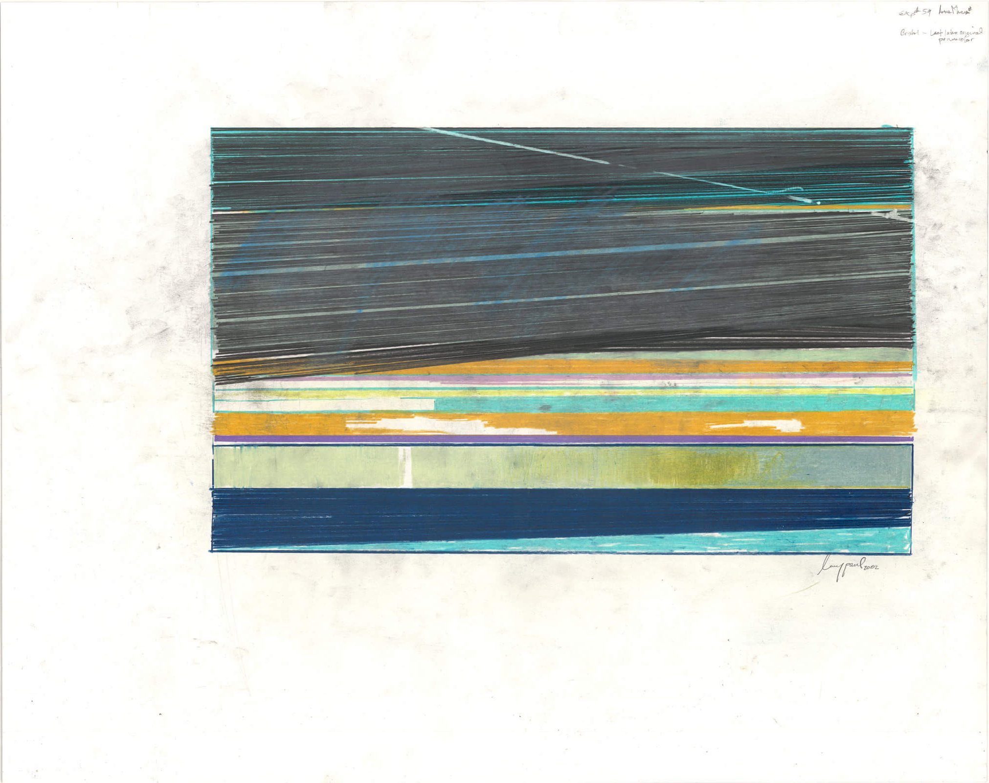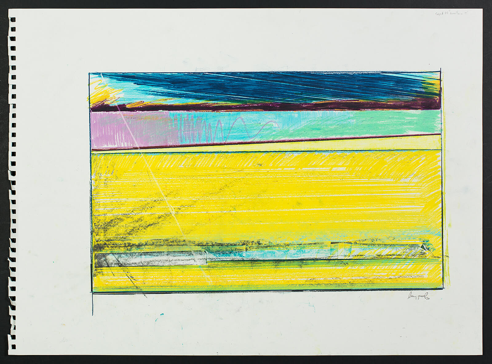 Personal, yet open and outwardly expressive, the Sunsets series presents an abstract expressionistic quality with an overlapping and abutting color technique that contrasts and brings the movements together at the same time. The typical colors are easily inspired by a wild brilliance offered by the mix of sunsets, storms, and open blue and green water. There is a rather “angry” application method in creating these artworks as noted in some frenzy of the pencil strokes, yet anger and calm can be appreciated together. The beauty of a fishing village often combines its aged infrastructure with the beauty and color of sunsets and the water vessels that are found within them in what becomes a creatively expressed scene or seascape.