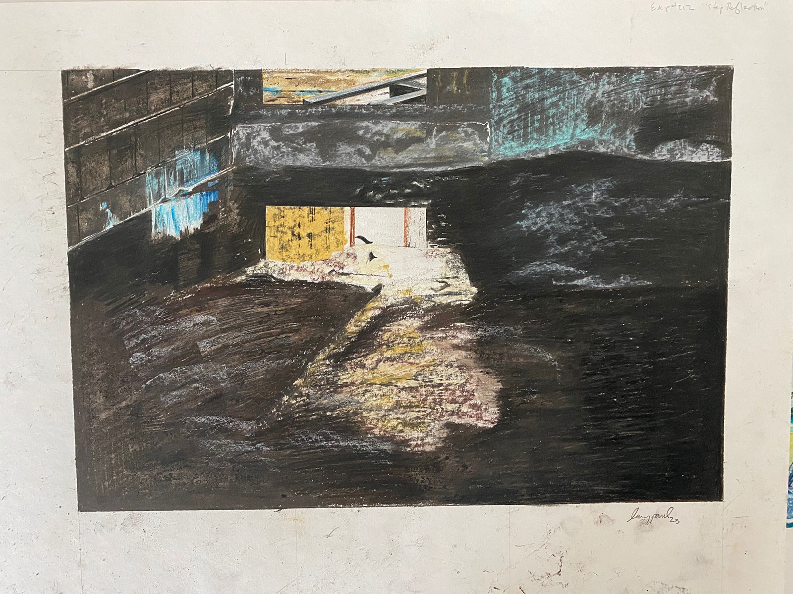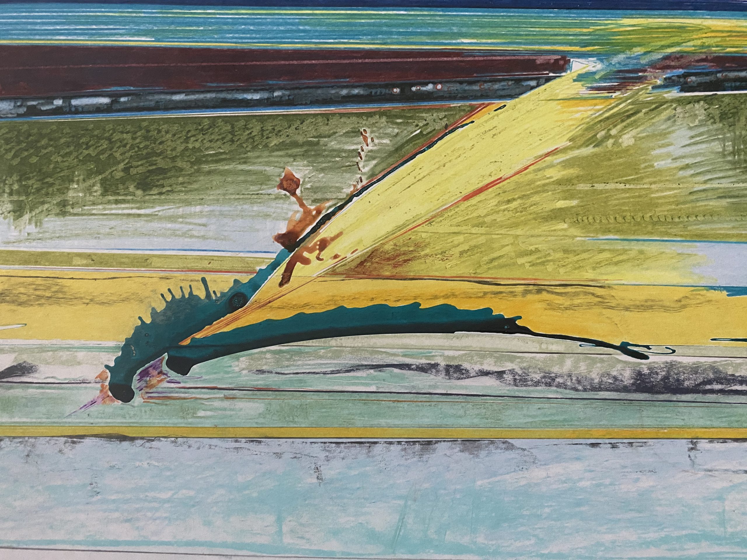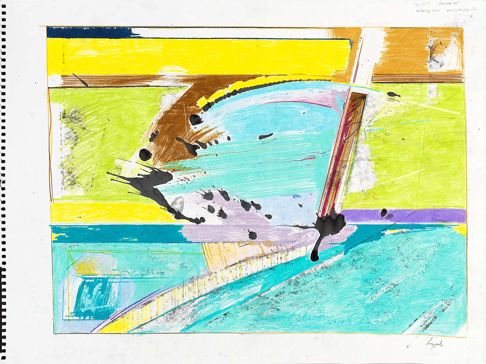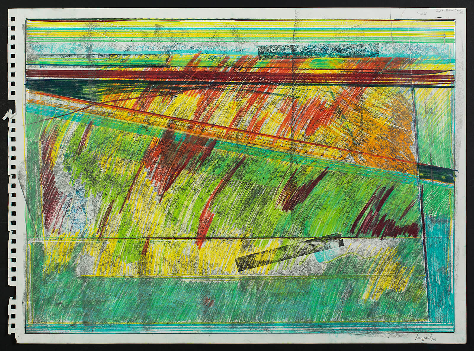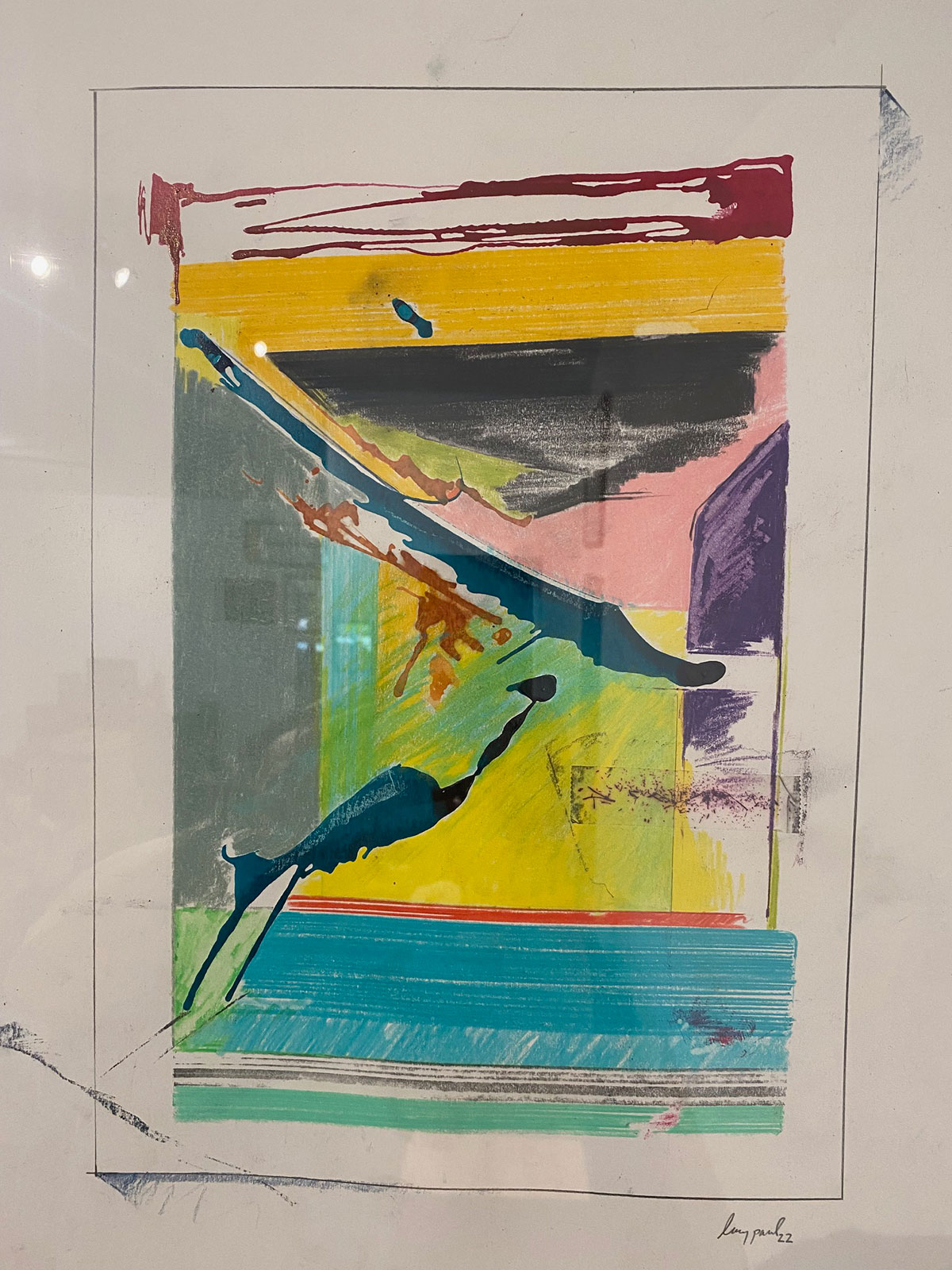 Personal, yet open and outwardly expressive, the Sunsets series presents an abstract expressionistic quality with an overlapping and abutting color technique that contrasts and brings the movements together at the same time. The typical colors are easily inspired by a wild brilliance offered by the mix of sunsets, storms, and open blue and green water. There is a rather “angry” application method in creating these artworks as noted in some frenzy of the pencil strokes, yet anger and calm can be appreciated together. The beauty of a fishing village often combines its aged infrastructure with the beauty and color of sunsets and the water vessels that are found within them in what becomes a creatively expressed scene or seascape.