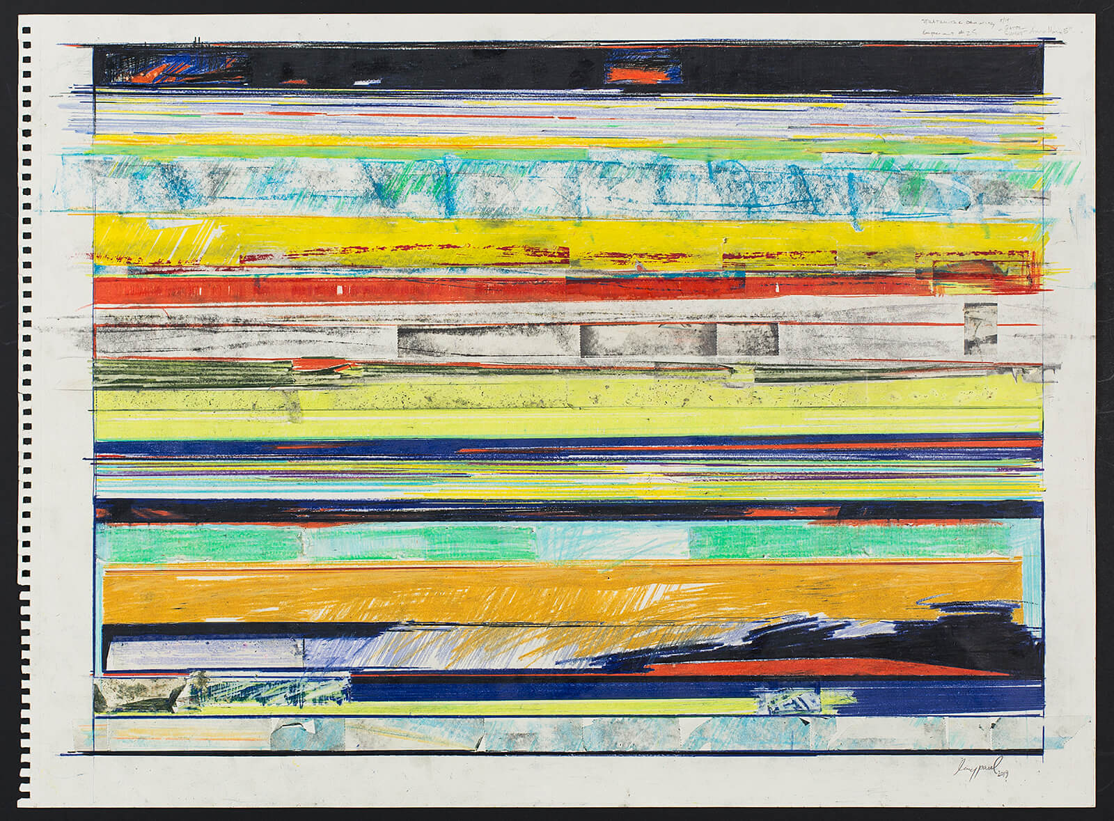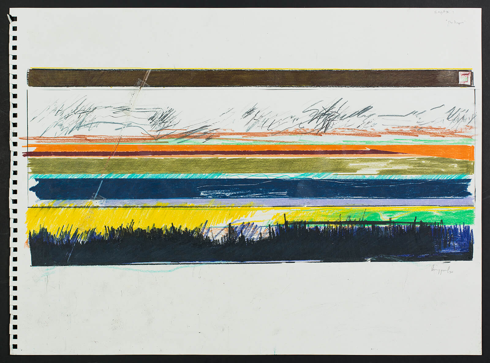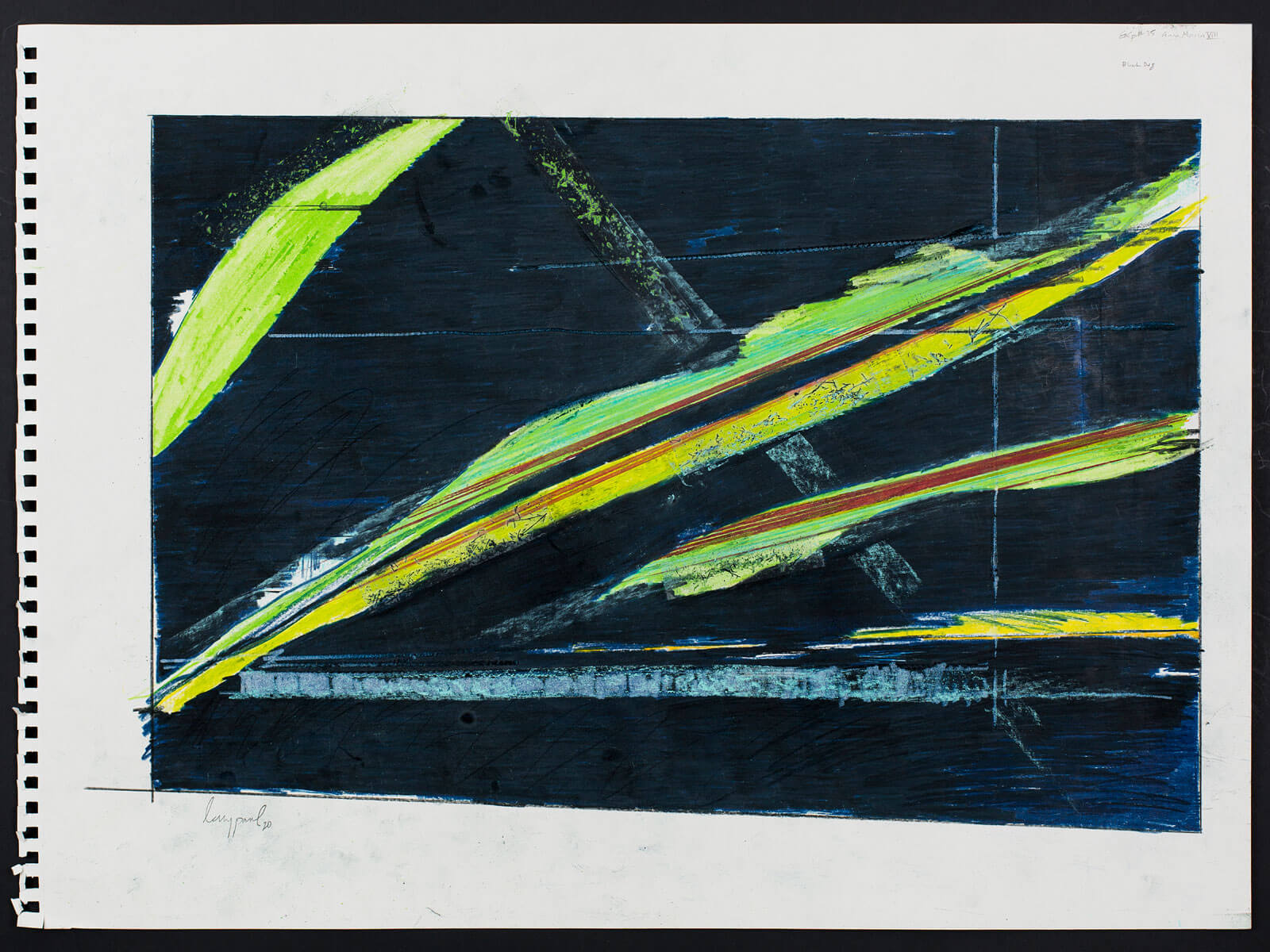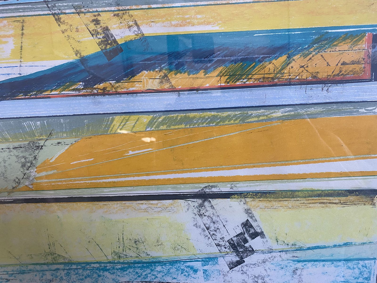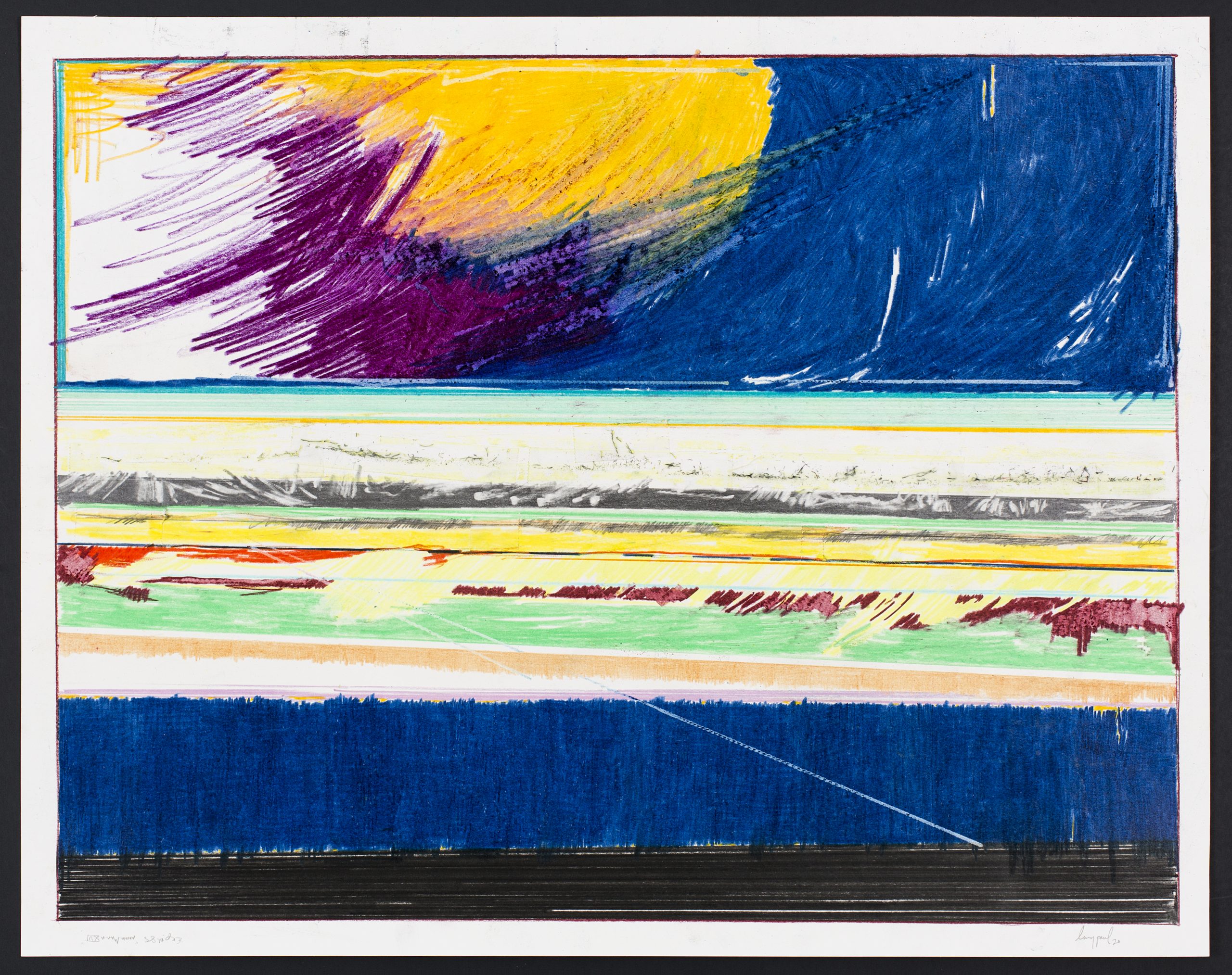 Personal, yet open and outwardly expressive, the Sunsets series presents an abstract expressionistic quality with an overlapping and abutting color technique that contrasts and brings the movements together at the same time. The typical colors are easily inspired by a wild brilliance offered by the mix of sunsets, storms, and open blue and green water. There is a rather “angry” application method in creating these artworks as noted in some frenzy of the pencil strokes, yet anger and calm can be appreciated together. The beauty of a fishing village often combines its aged infrastructure with the beauty and color of sunsets and the water vessels that are found within them in what becomes a creatively expressed scene or seascape.