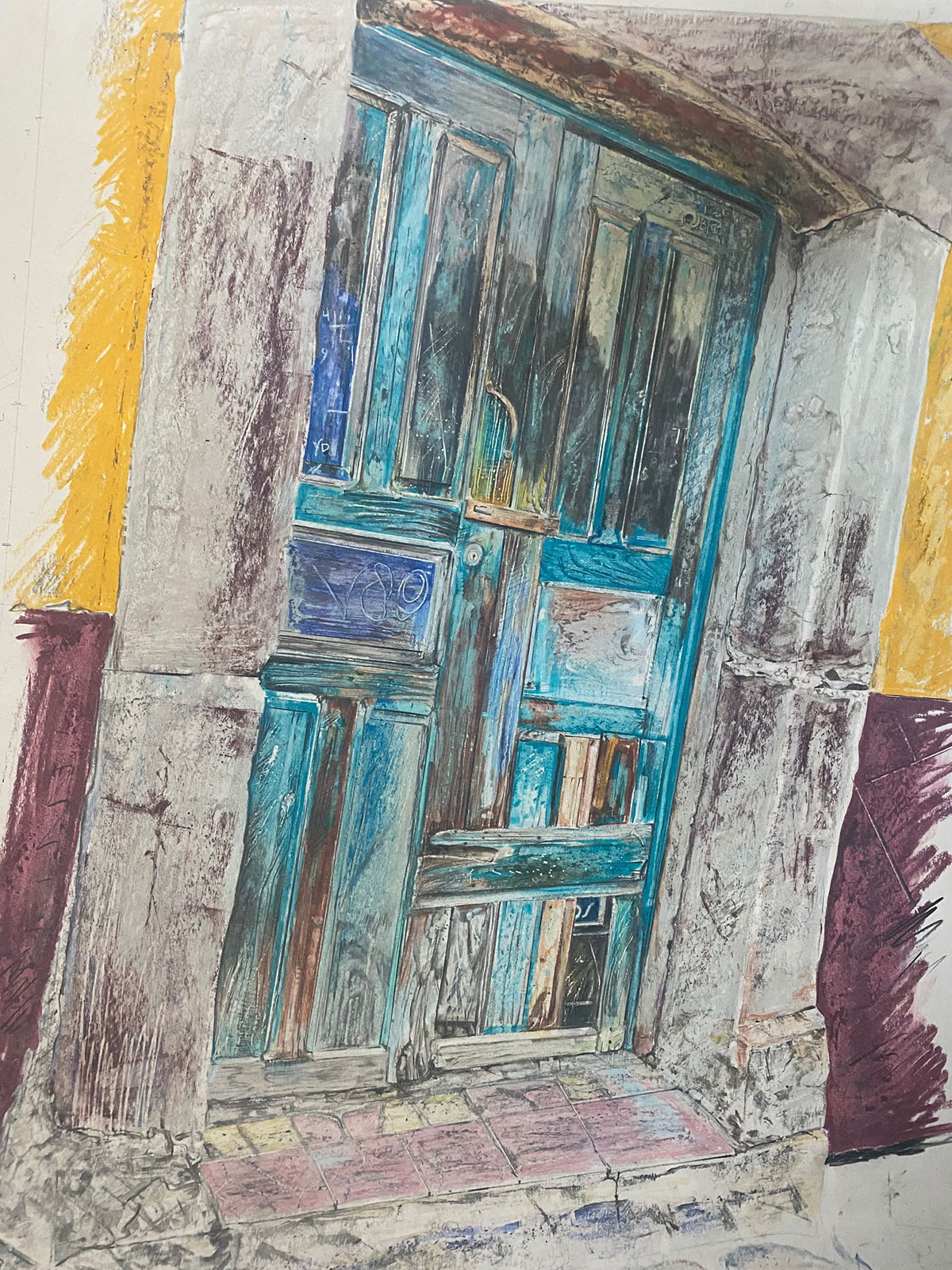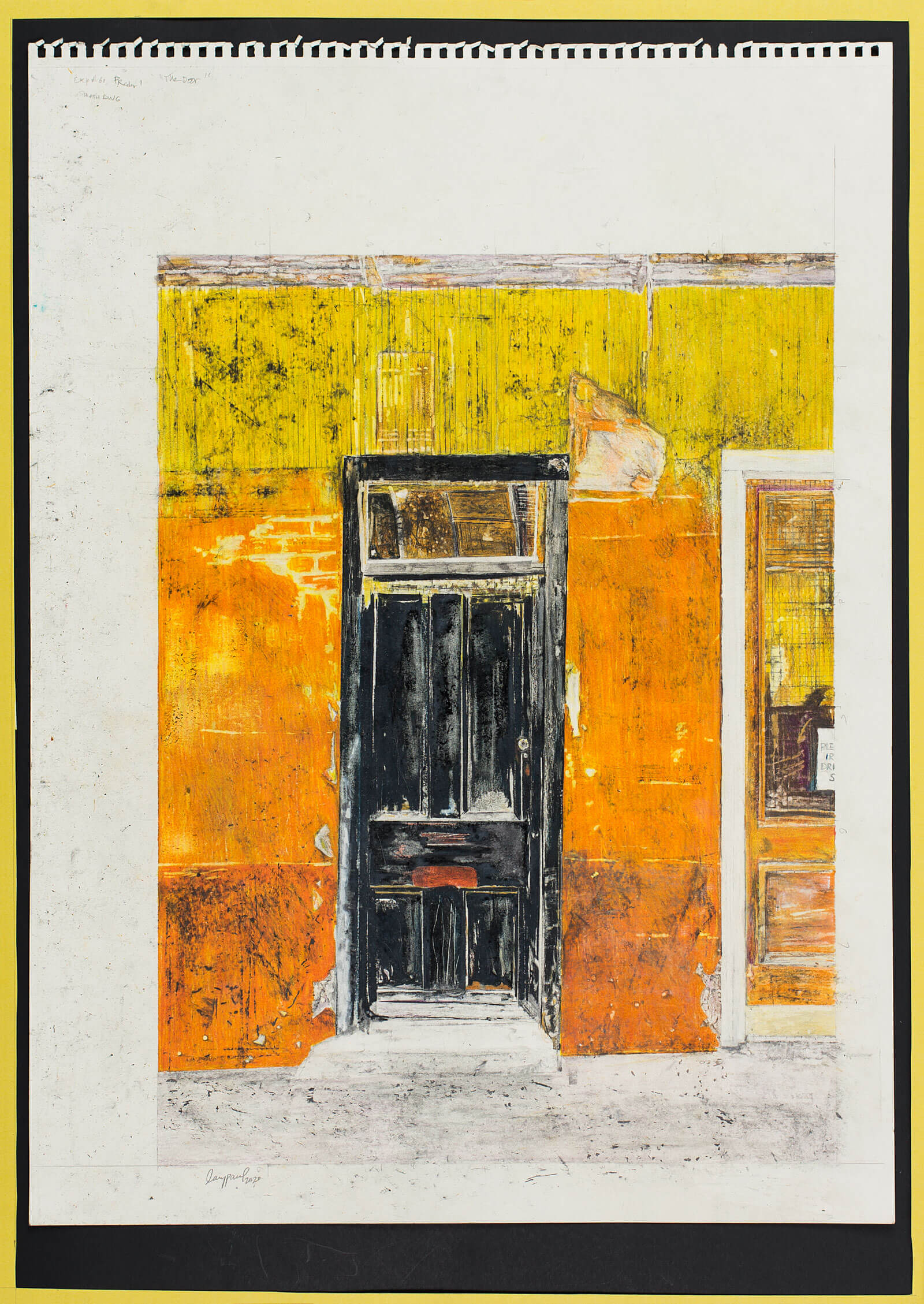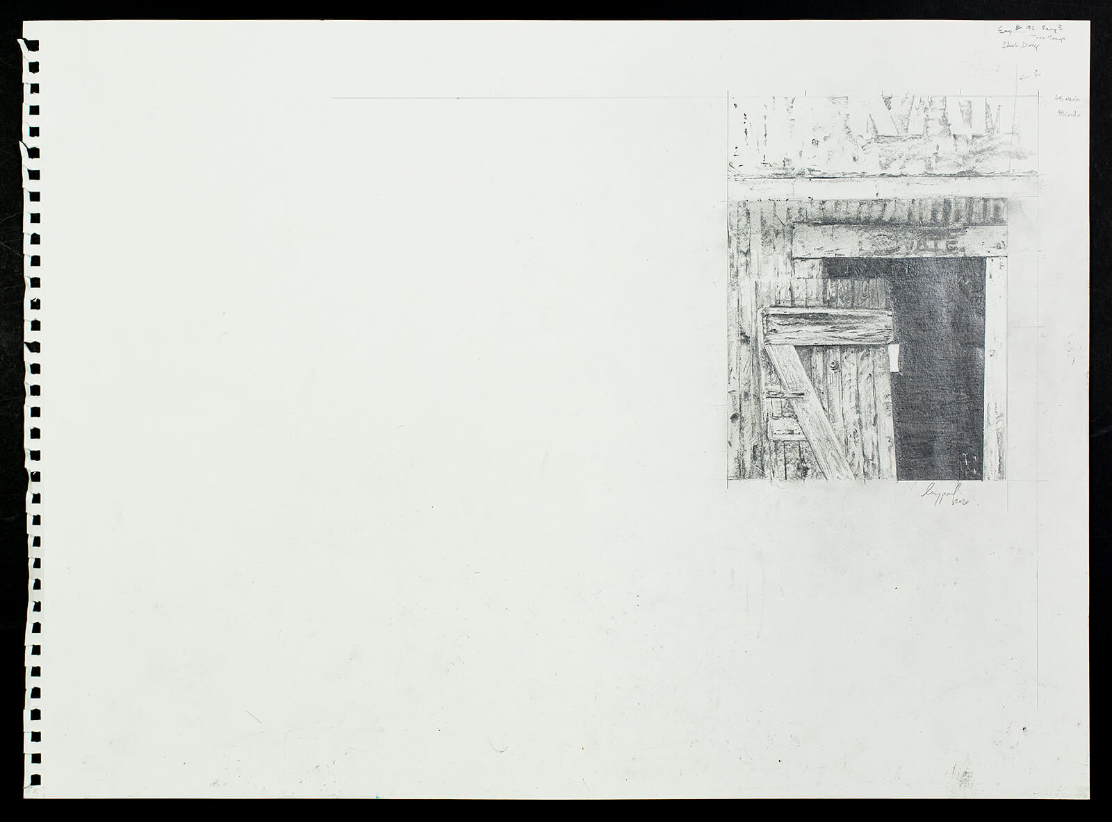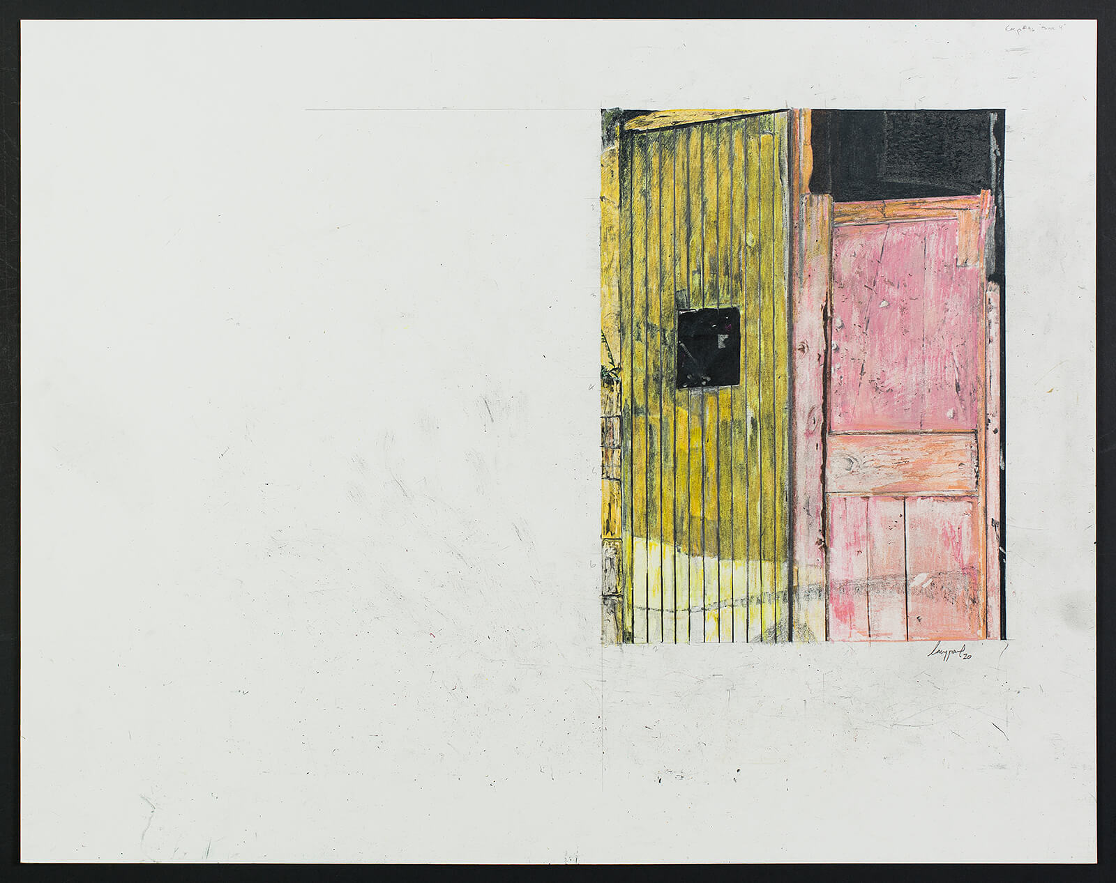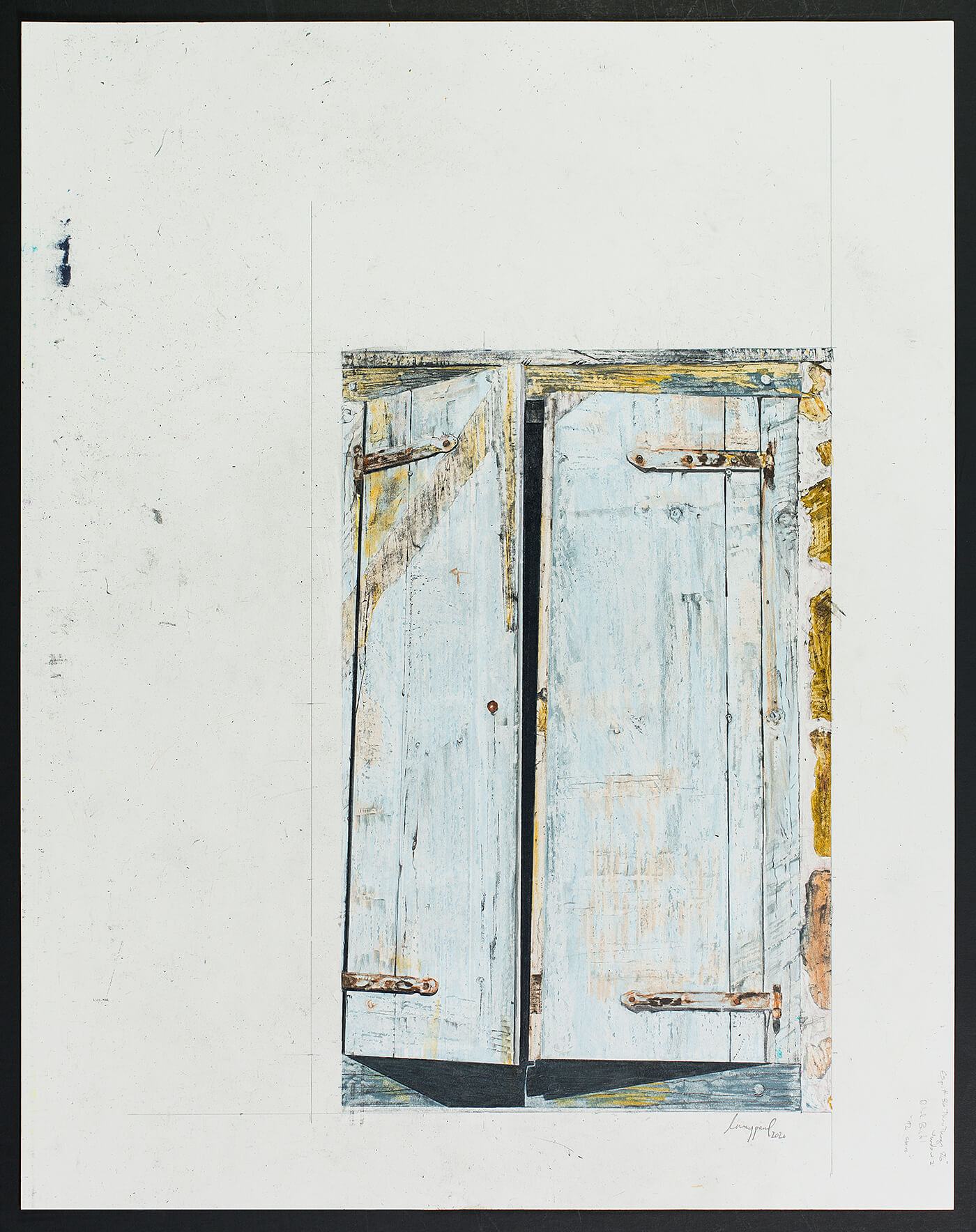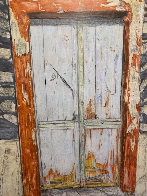 The thru-things series presents an impressionistic realism quality focusing primarily on architectural openings and objects. Both color and monotone drawings are considered. The preferred composition usually consists of offset or partial close-ups of decayed/aged building elements and areas. Doors and windows that have been painted with vivid, yet now fading colors in real life are preferred subjects for drawing. Dark and light suggestive interior ghost shapes seen beyond the windows, or a door that may be ajar, are bonuses to the artwork in that they allow the observer to think about what activity is taking place, or not, or is hiding behind the full or partial opening.