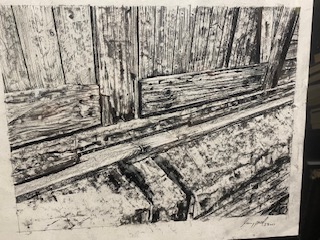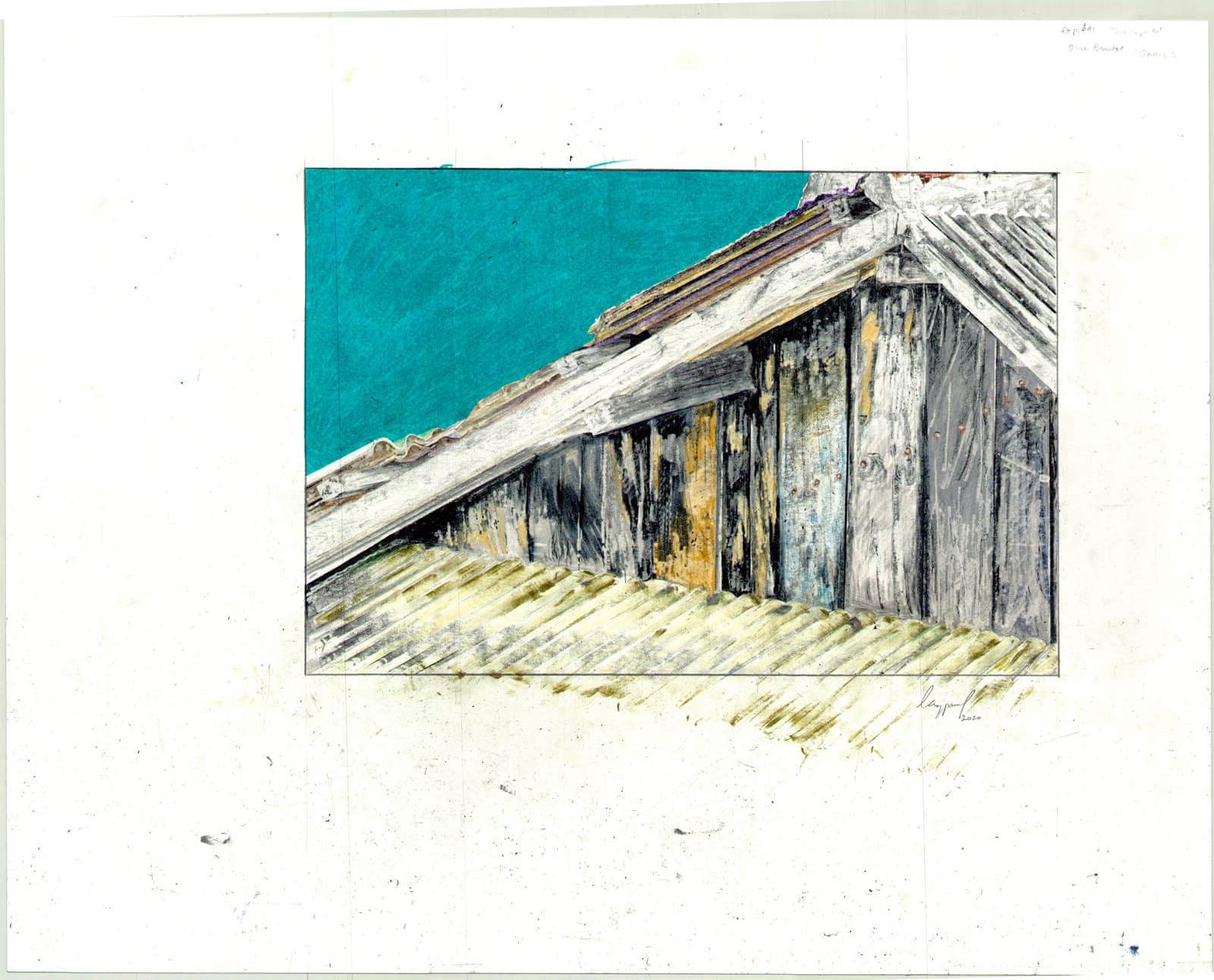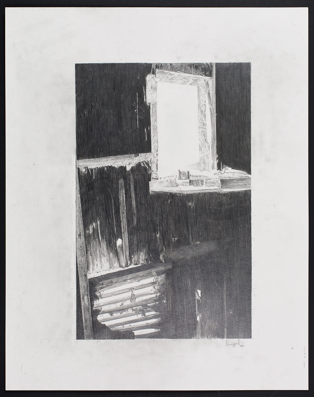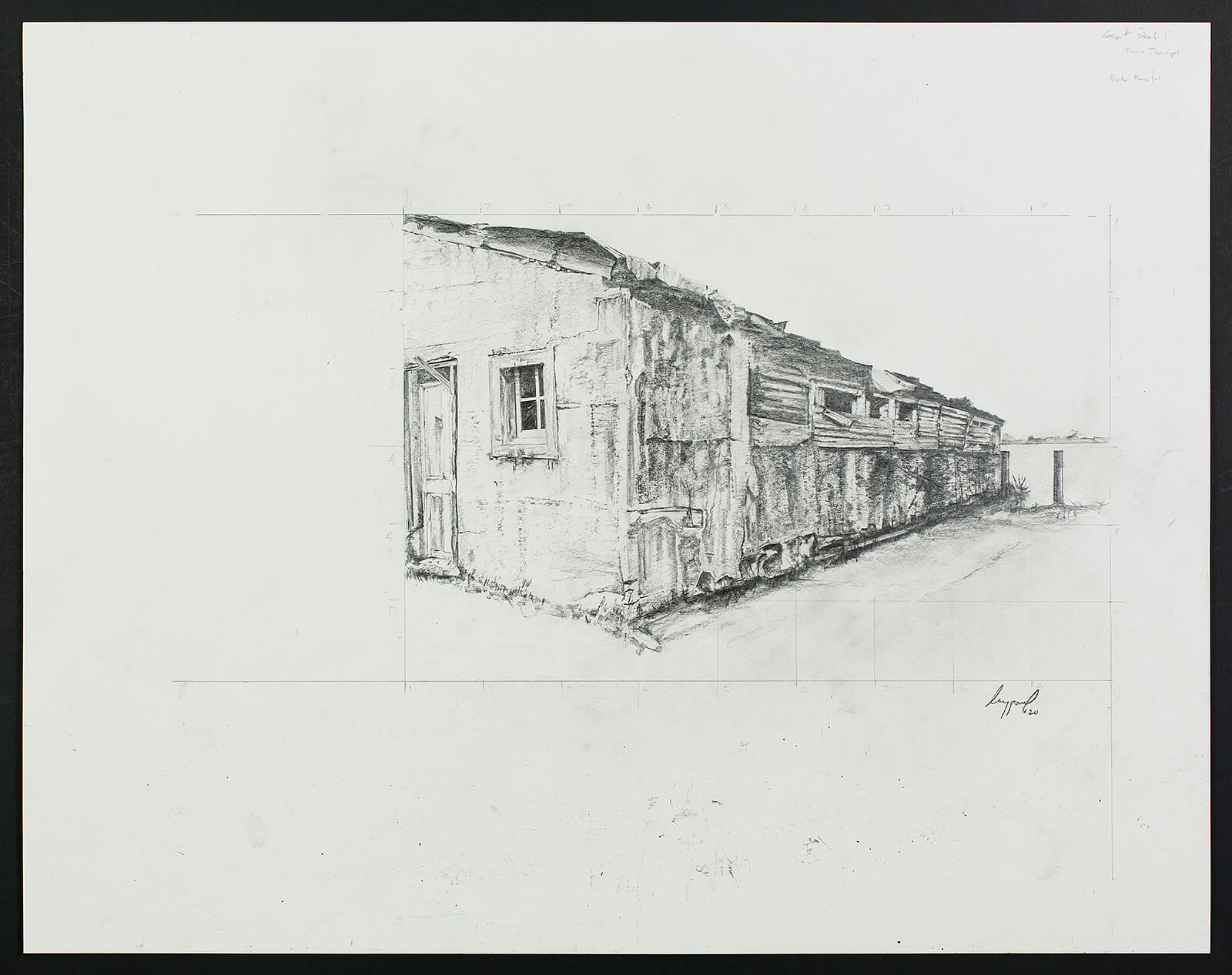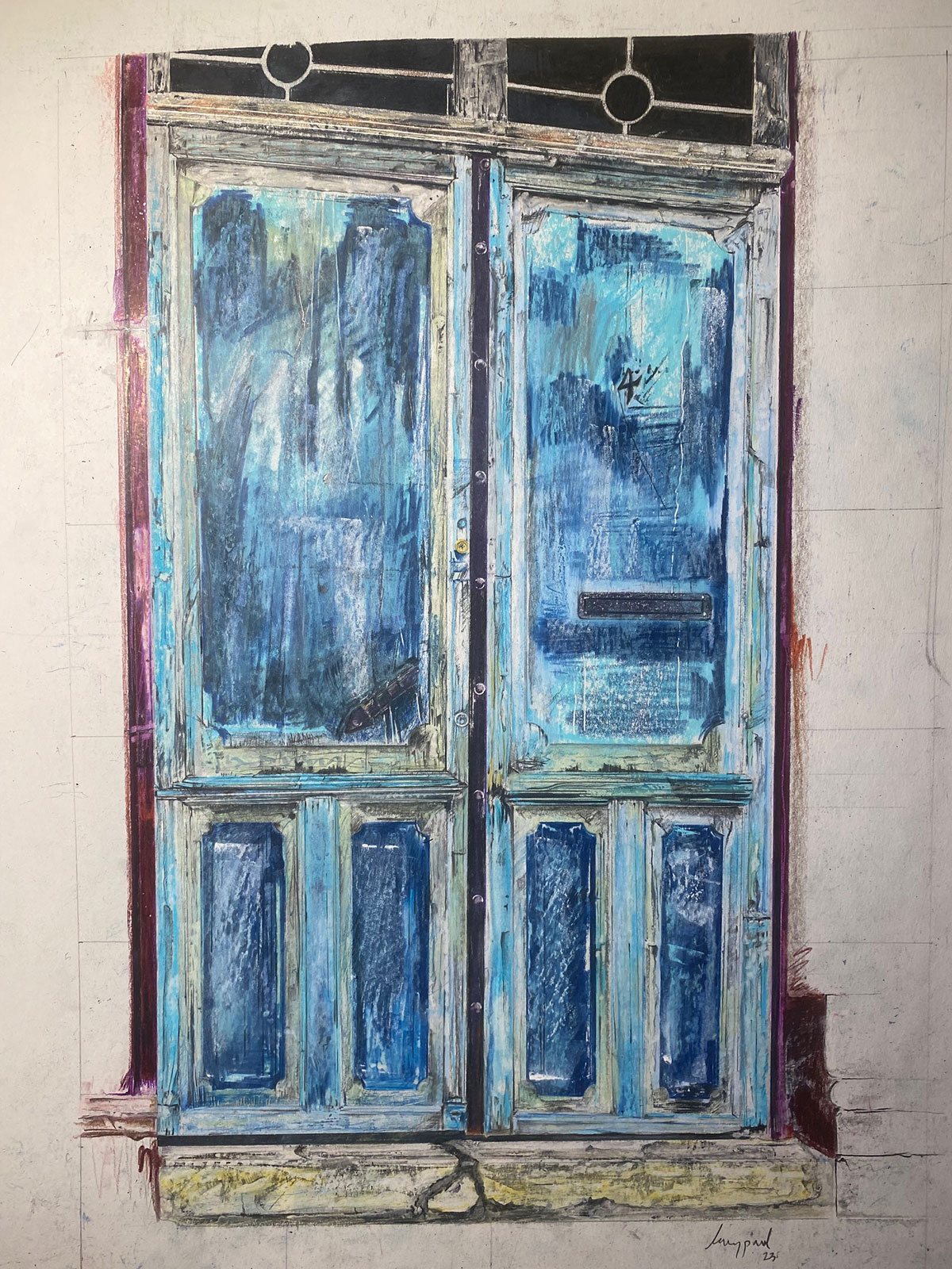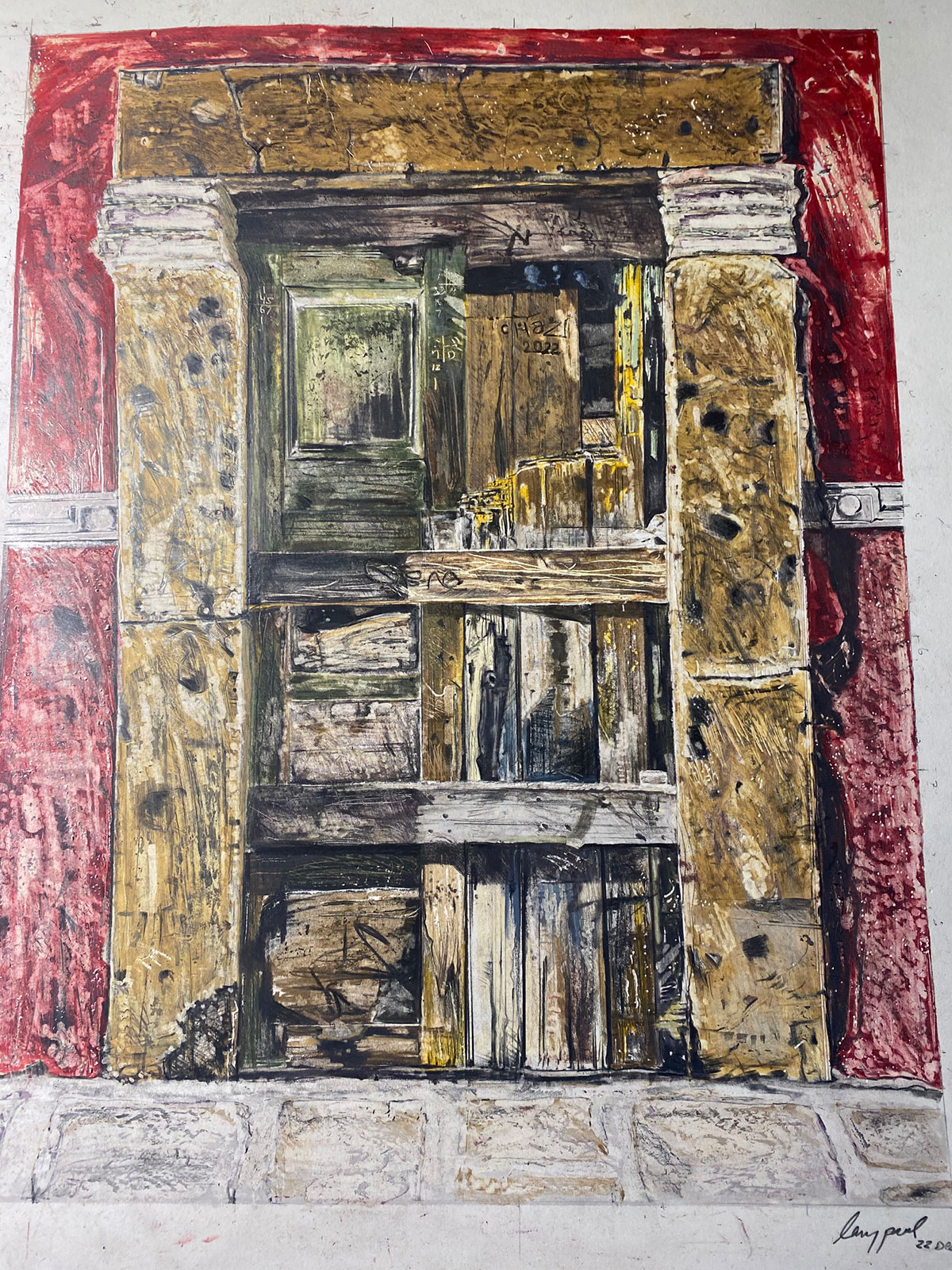 The thru-things series presents an impressionistic realism quality focusing primarily on architectural openings and objects. Both color and monotone drawings are considered. The preferred composition usually consists of offset or partial close-ups of decayed/aged building elements and areas. Doors and windows that have been painted with vivid, yet now fading colors in real life are preferred subjects for drawing. Dark and light suggestive interior ghost shapes seen beyond the windows, or a door that may be ajar, are bonuses to the artwork in that they allow the observer to think about what activity is taking place, or not, or is hiding behind the full or partial opening.
