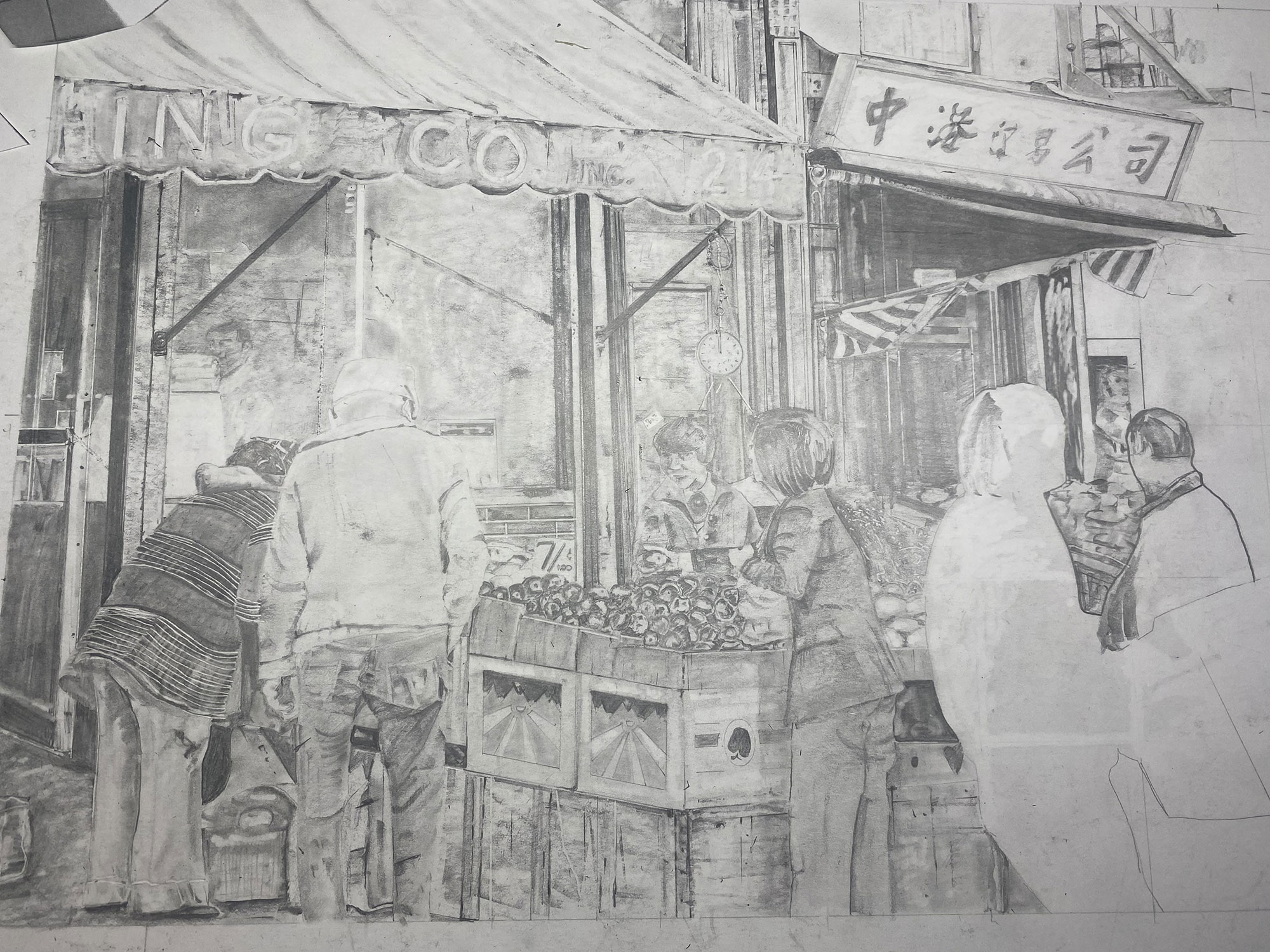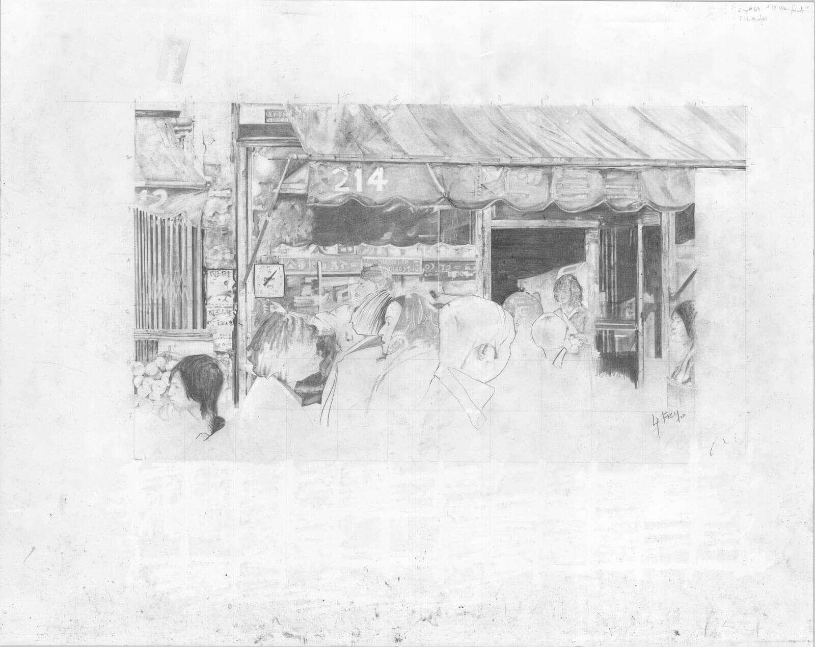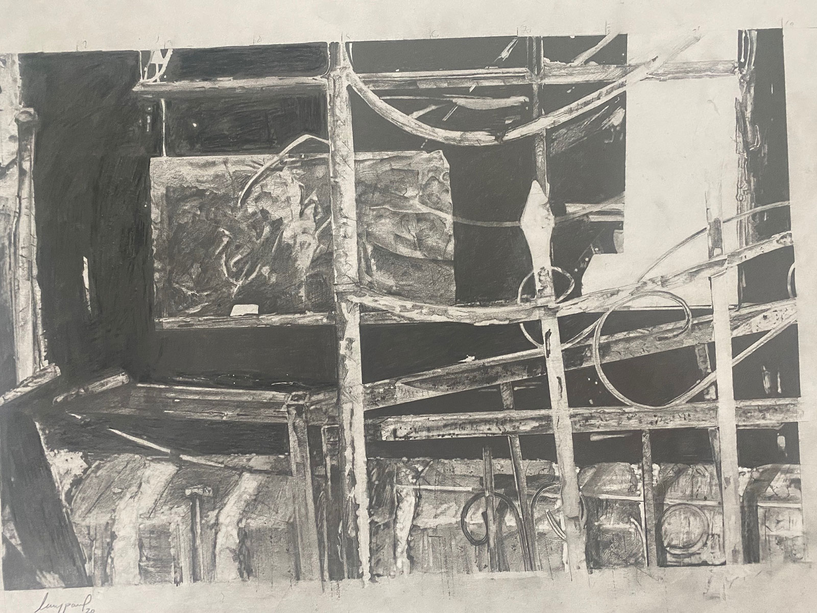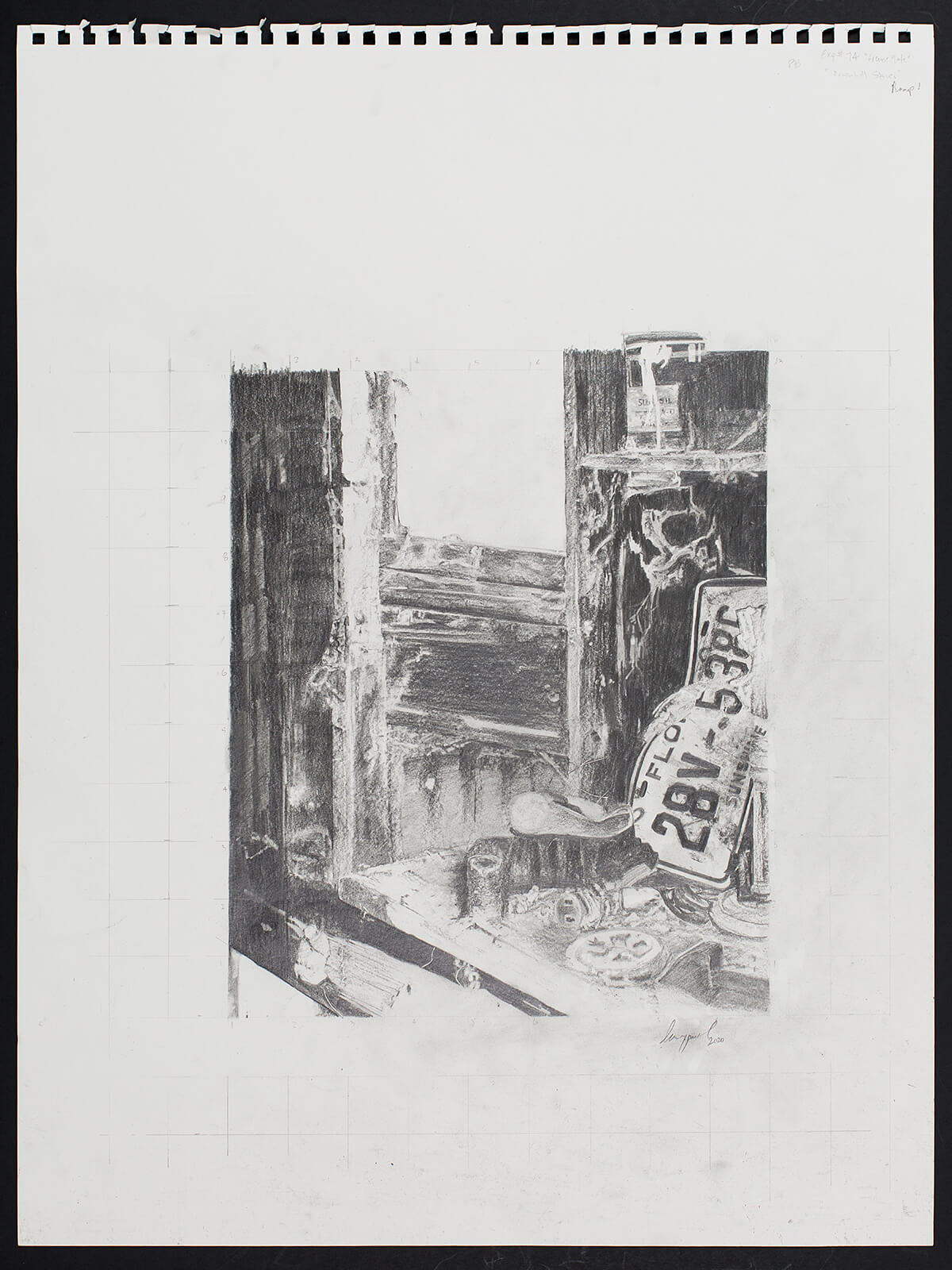 Both styles reflect a dirty composition that leaves all details of the drawing process on the media surface. This way, the observer can see part of the process held in time of the drawing such as scale grids, notes, smudges, errors, tears, paper edges, etc. According to the artist, an artwork is truer and more complete when revealing these qualities instead of cleaning them up for final presentation. Eraser and pencil shavings can create surficial textures in the art during drawing and are rarely brushed away. The full sheet of the media surface is also preserved and becomes part of the art presentation. Clear adhesive tape is found in some of the art because its application also creates textural effects. Erasure, irregular perspectives, and unusual compositions are important elements of each style that give his drawings a certain edginess and friction. The closer one looks, the more poignant this edginess reveals itself.